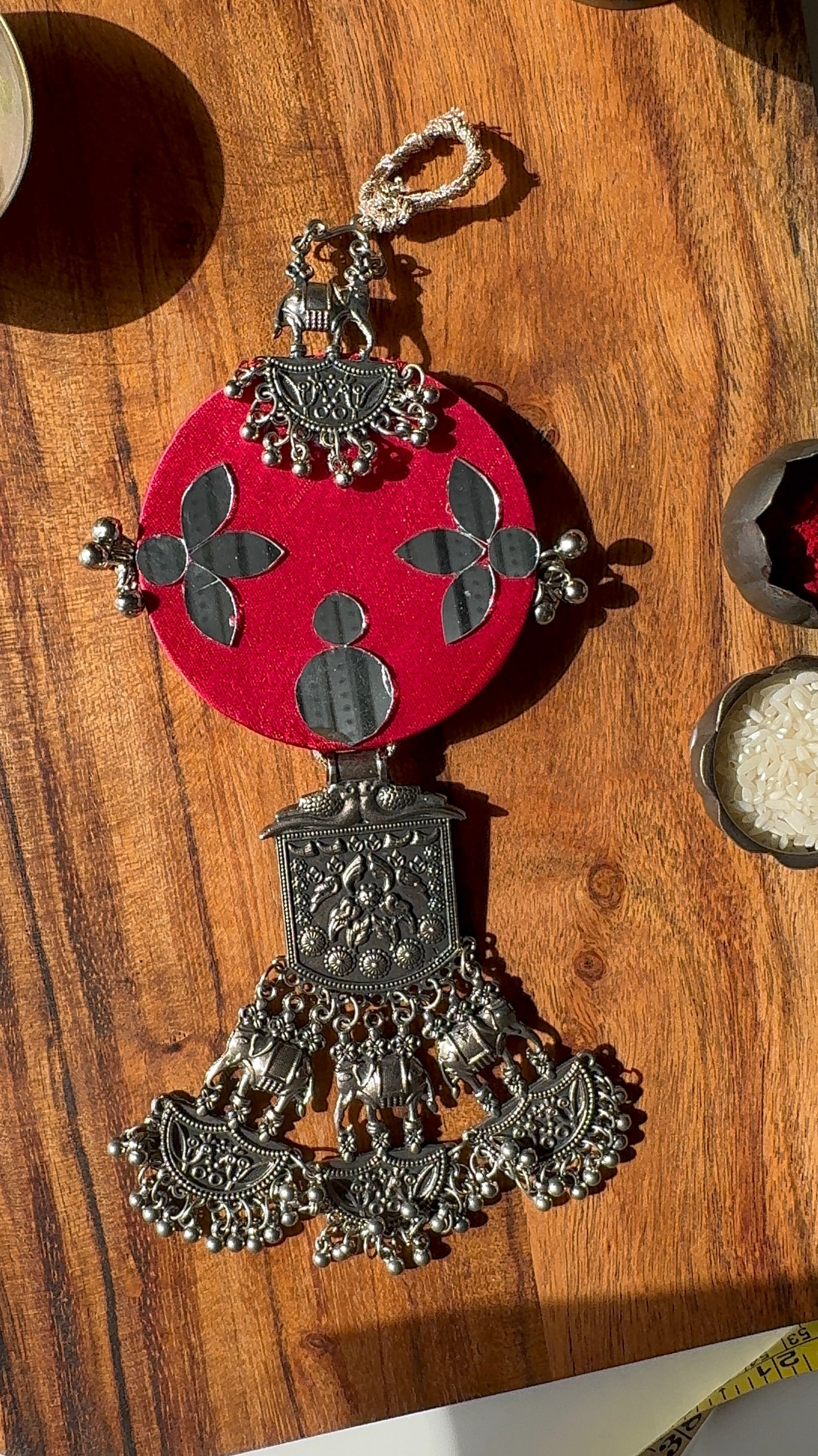 RoopChandrika is a silver-look wall hanging that also serves as a traditional jhudo key holder. This handmade Indian decor piece features mirror and jewellery art, making it a unique oxidised wall hanging. Use it as a decorative jhudo or a traditional Indian key holder in your pooja room or living space. It is a heritage-inspired gift and a beautiful small wall art piece crafted in India. Proudly made by IBHI, this mirror craft decor is a fine example of upcycled Indian art—a silver-toned hanging piece that celebrates tradition with elegance.