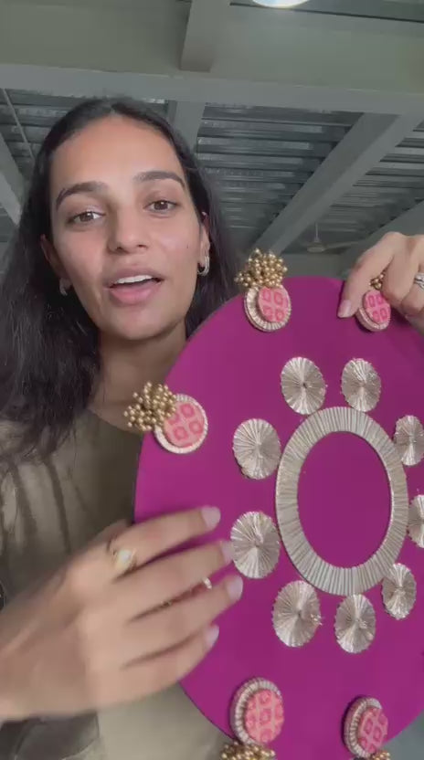 This handcrafted piece features two reversible circular discs (each 14 inches in diameter) mounted on a curved iron stand. Each side presents a different fabric and detailing — allowing you to rotate and rearrange them to suit the occasion, mood, or styling theme.