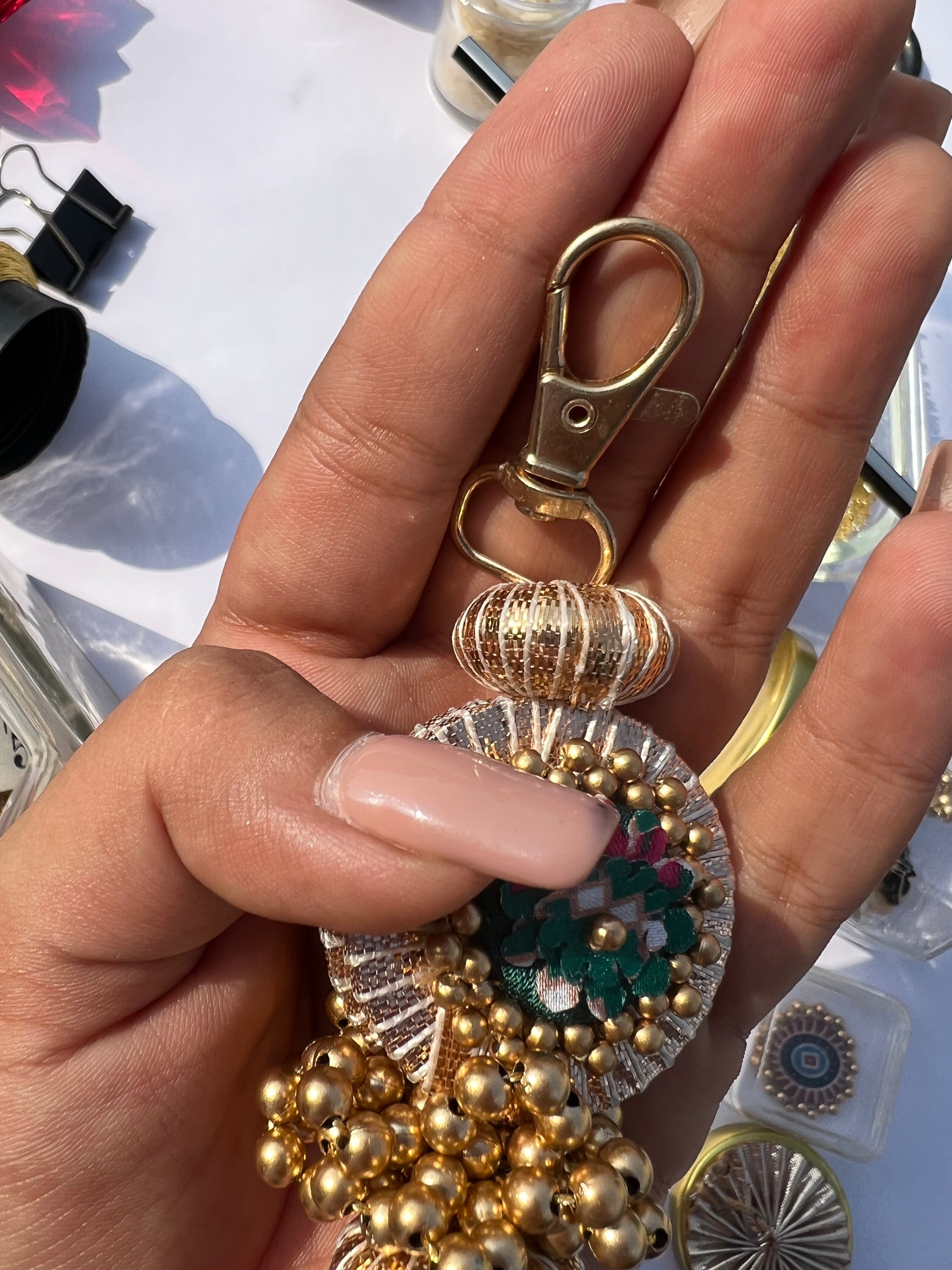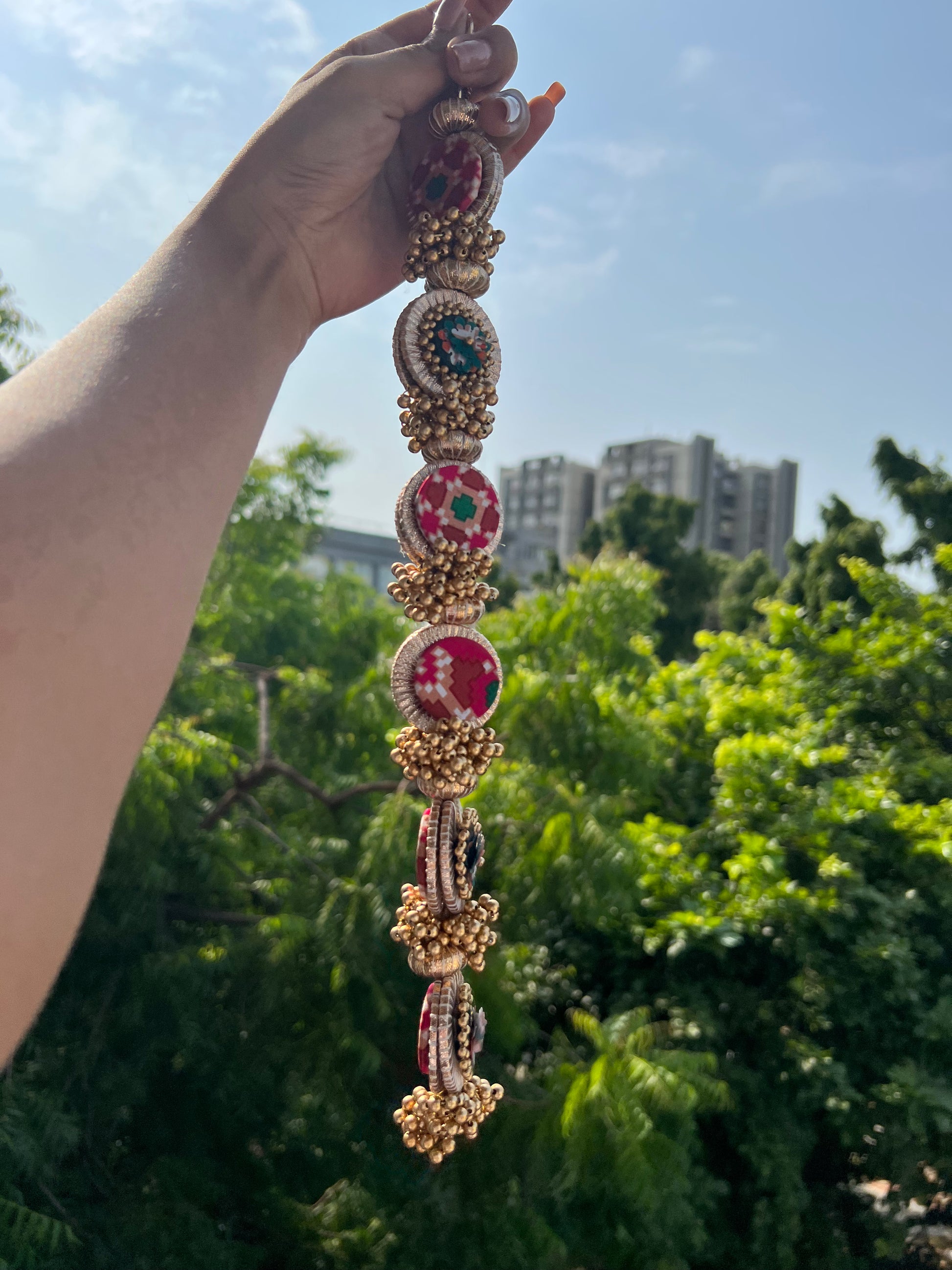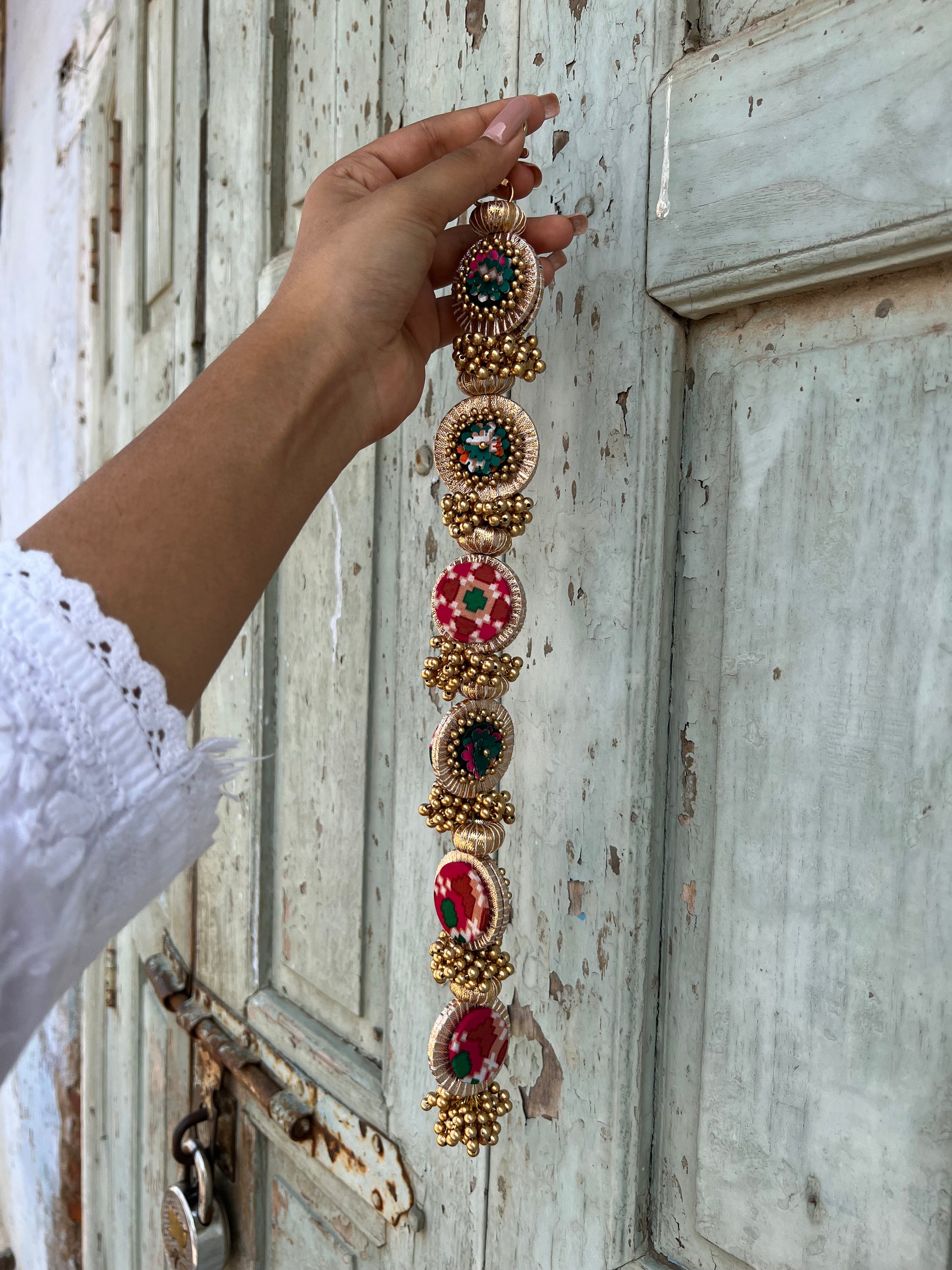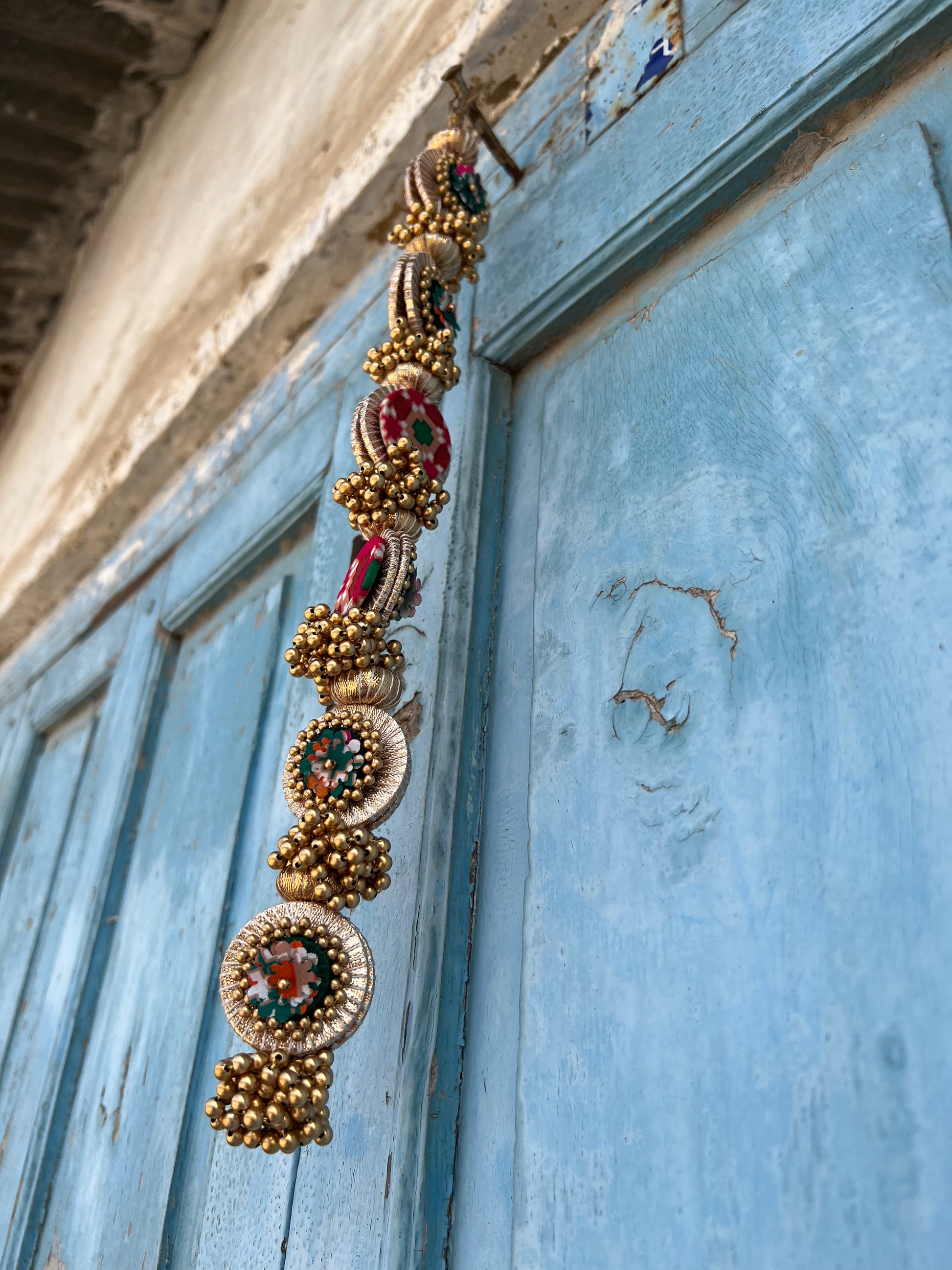 It's a stand-alone pretty piece, crowd favorite and a versatile styling charm. Our signature lumba which made to torans, platters and more has now been curated into a side hanging. It can be styled on corners of the door, in pretty corners and more.