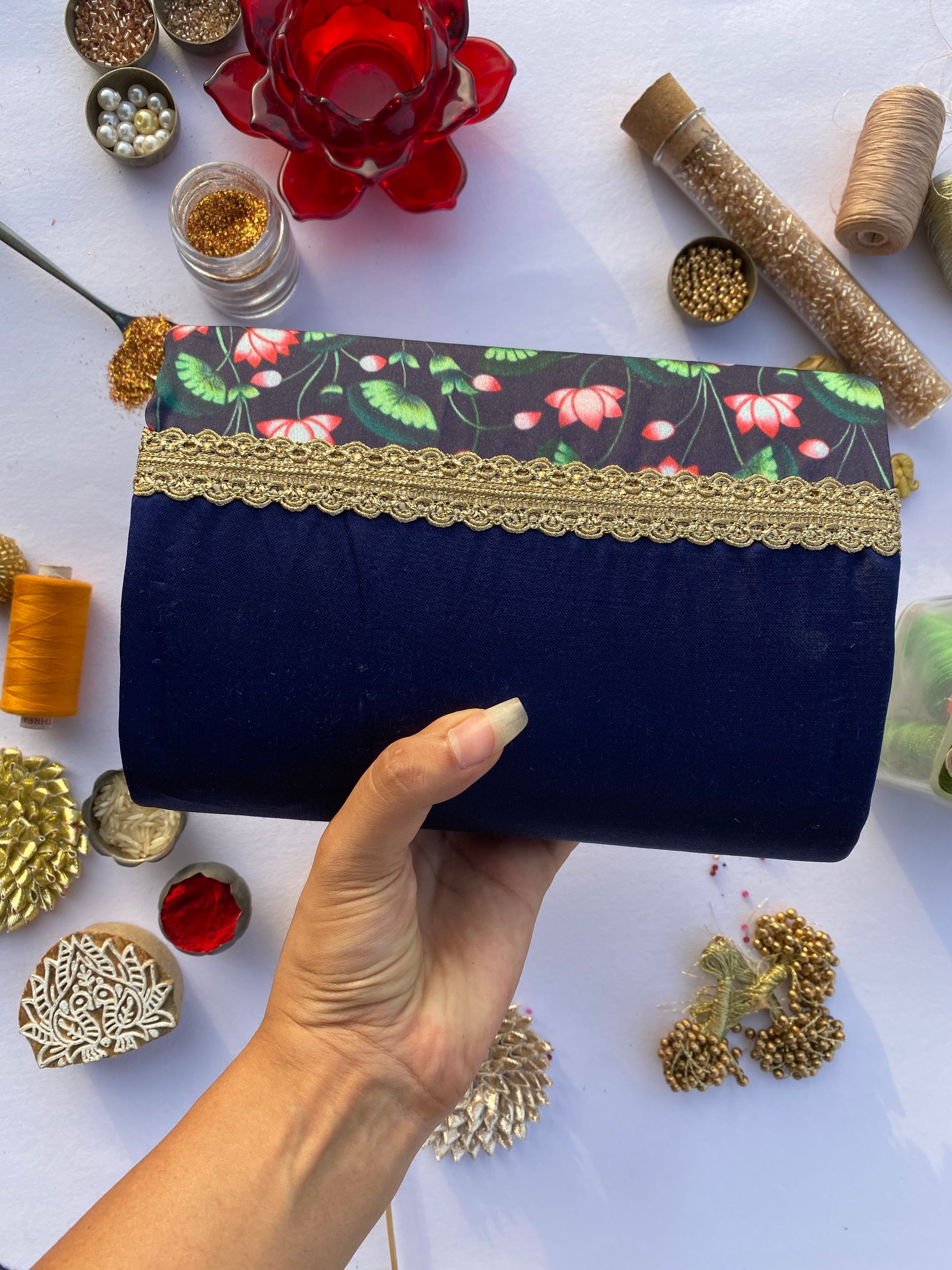 ✨ Pichwai-Inspired Digital Print: This clutch is adorned with a mesmerizing ombre pink lotus design in a traditional Pichwai format, symbolizing purity and divine beauty. The deep blue background enhances the rich aesthetics, making it a statement piece.