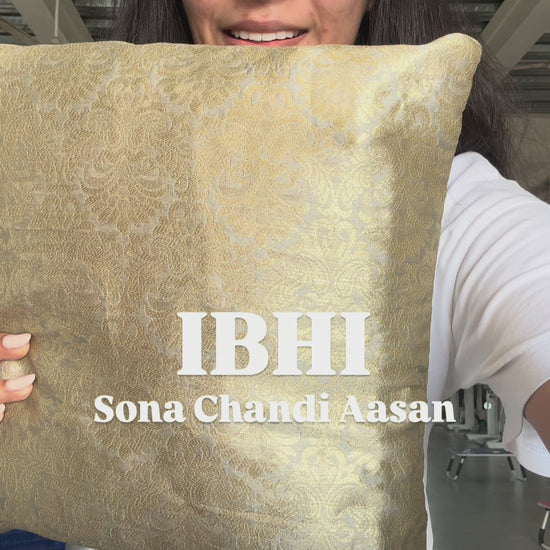 Sona Chandi Aasan is a refined expression of Indian craftsmanship, designed in timeless gold and muted silver tones. This luxurious set of four handcrafted Banarasi aasans brings elegance, comfort, and heritage together for premium floor seating and sacred spaces.