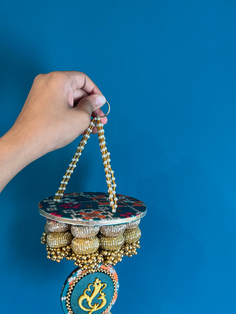 DETAILS IN DETAIL: We combined our classic diya hanging with our hand-painted gold Ganesh. Strands of pearl and transparent gold beads are used to suspend the entire piece of art. The basal diameter for the diya is 5 inches and total length of the hanging is 12 inches.