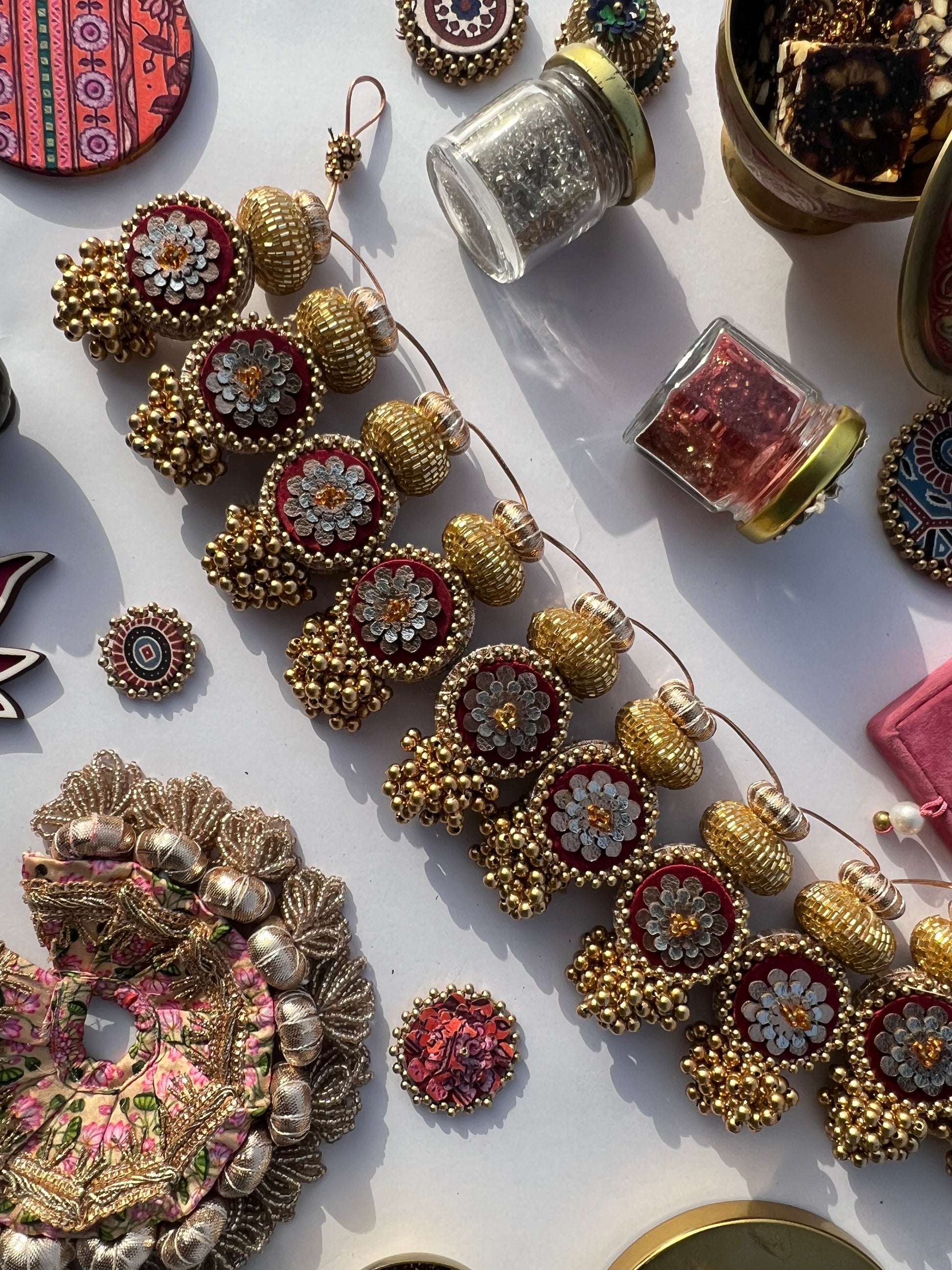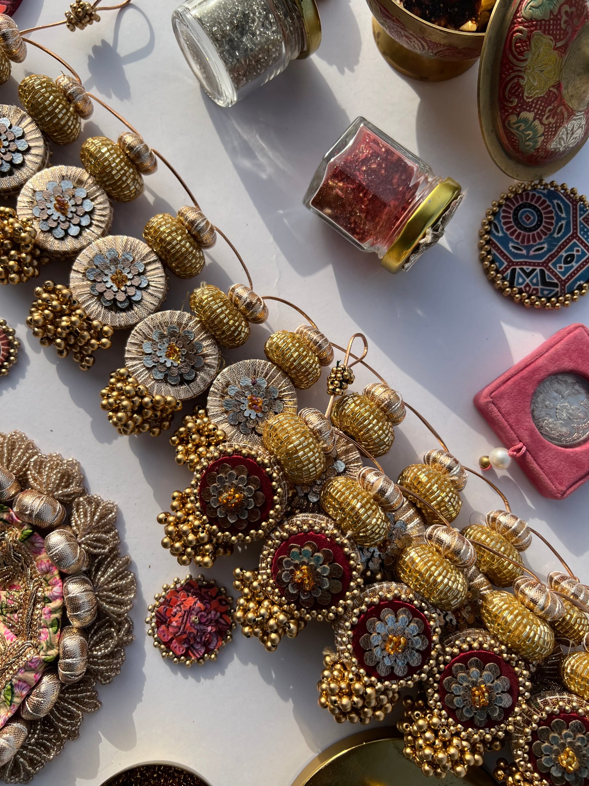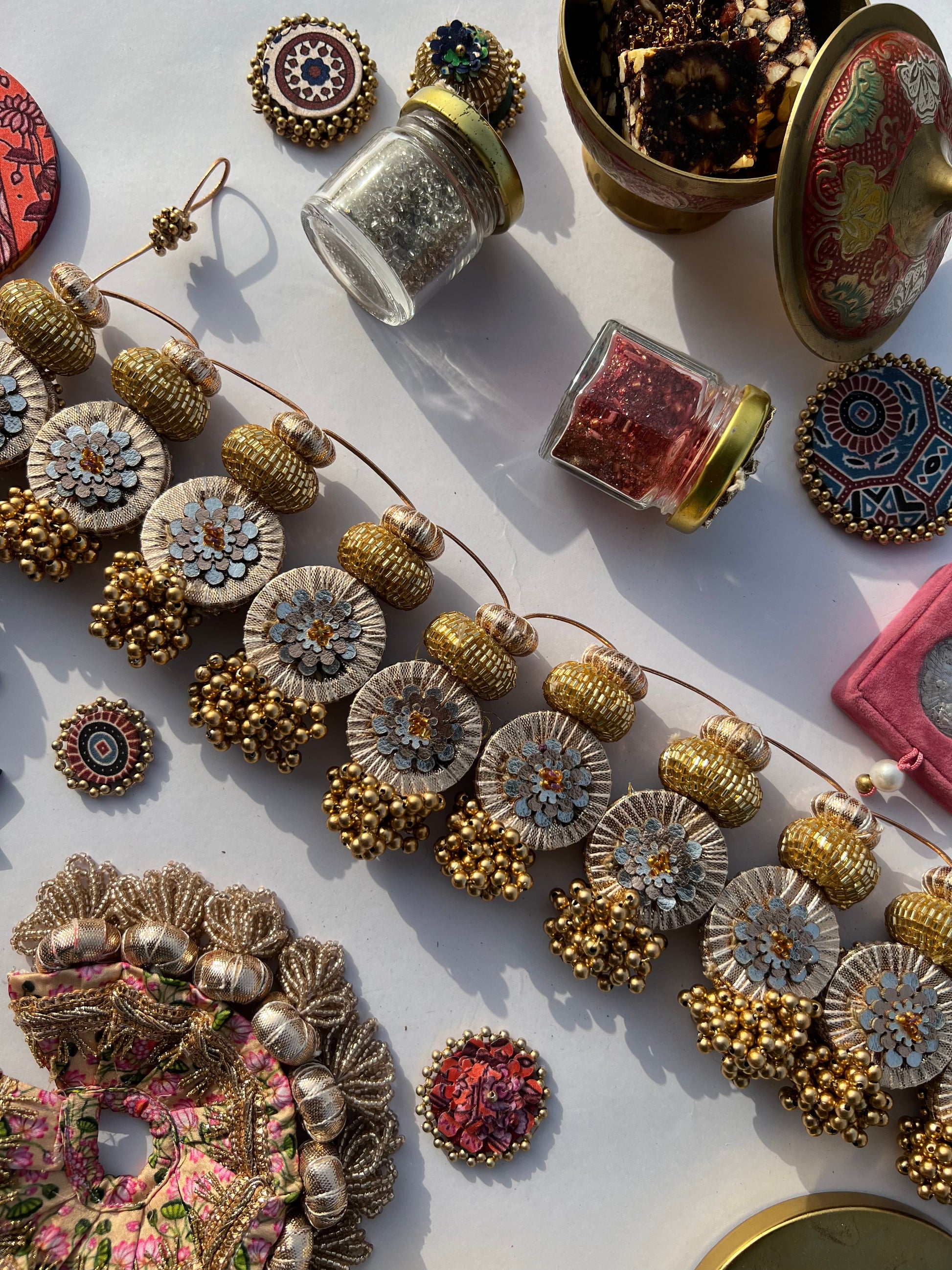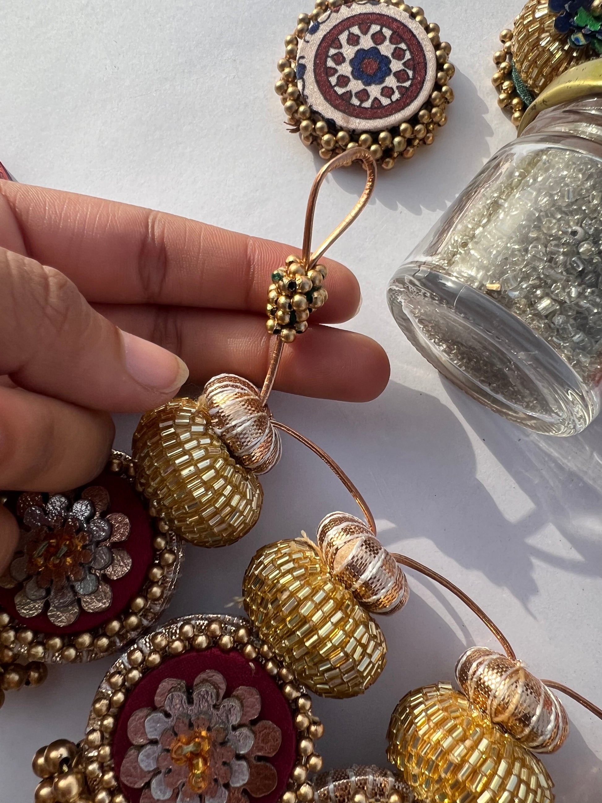 All IBHI products are meticulously handmade, involving various stages of different craftsmanship. Our creations are a blend of layers of high-quality fabric, Medium Density Fibre (MDF) for structure, and intricate beads and embellishments. The beads are meticulously connected using rolls of threads and hand stitches, adding to the uniqueness and charm of our products.