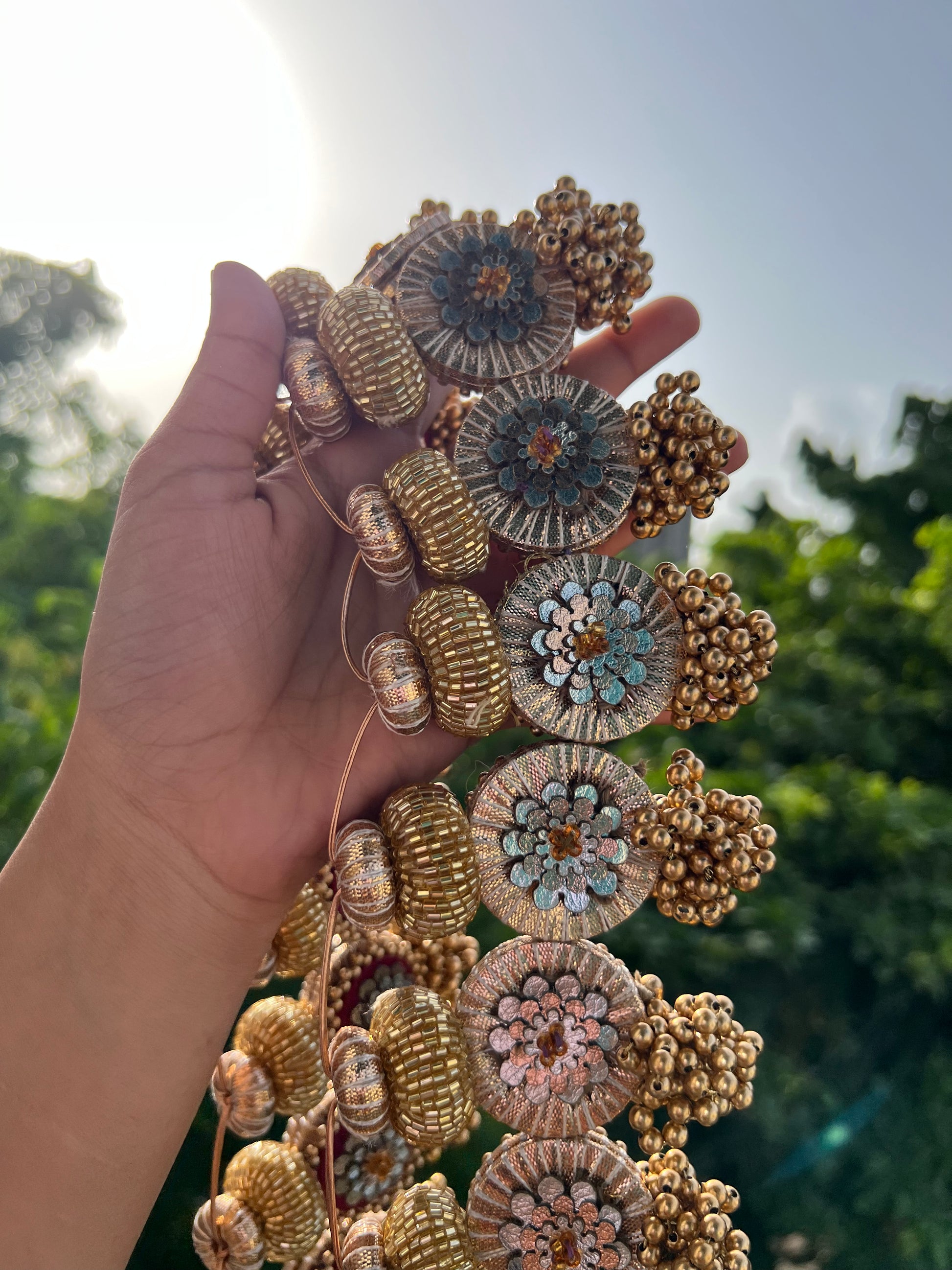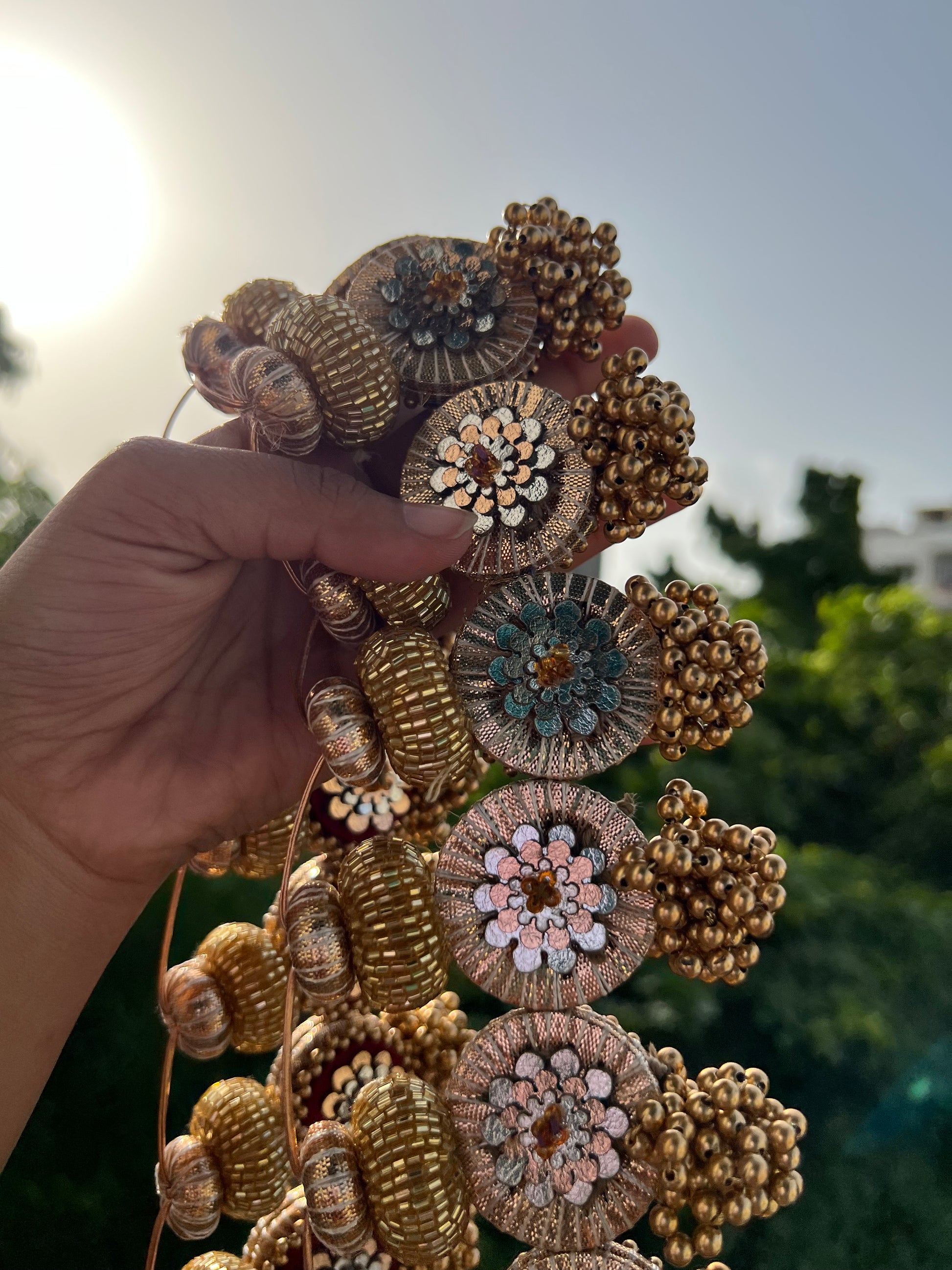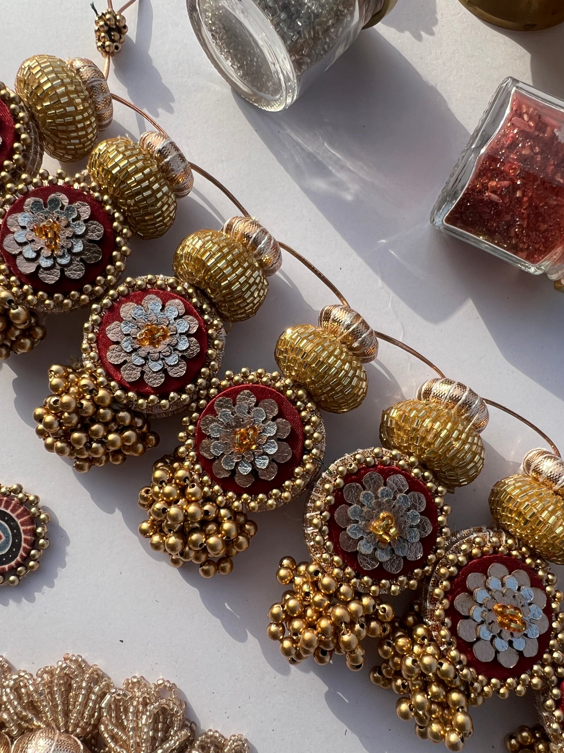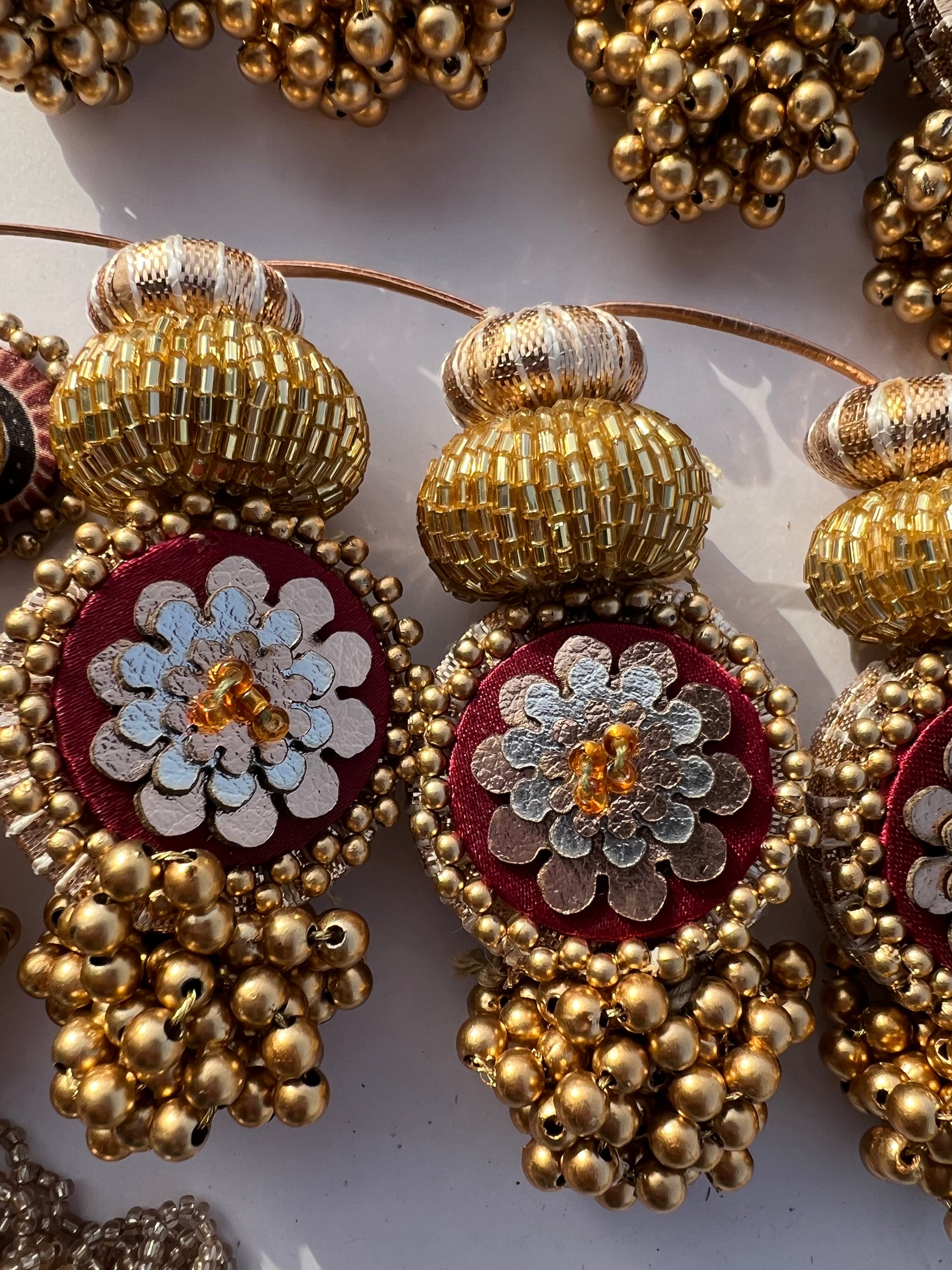 Details: Each pair of lumba is stitched together on one piece of thread. The lumba which holds the flowers is 1.5 inches in diameter. Each lumba is attached to a wooden bead which is wrapped with rose-gold tone Gota Patti. For the hooks of the toran, the silk thread is stitched with small beads into a loop. The total length of each tasseled lumba bunch is 5 inches.