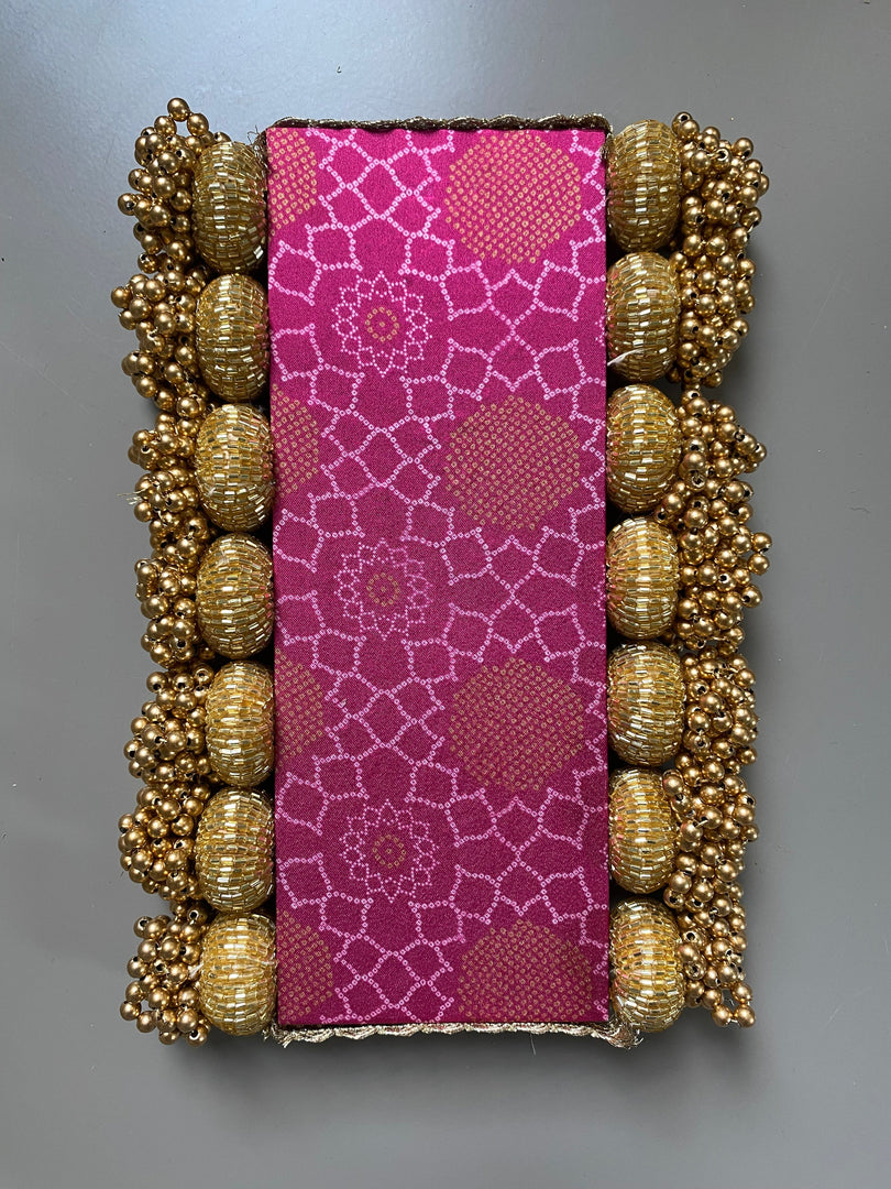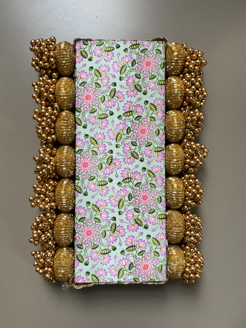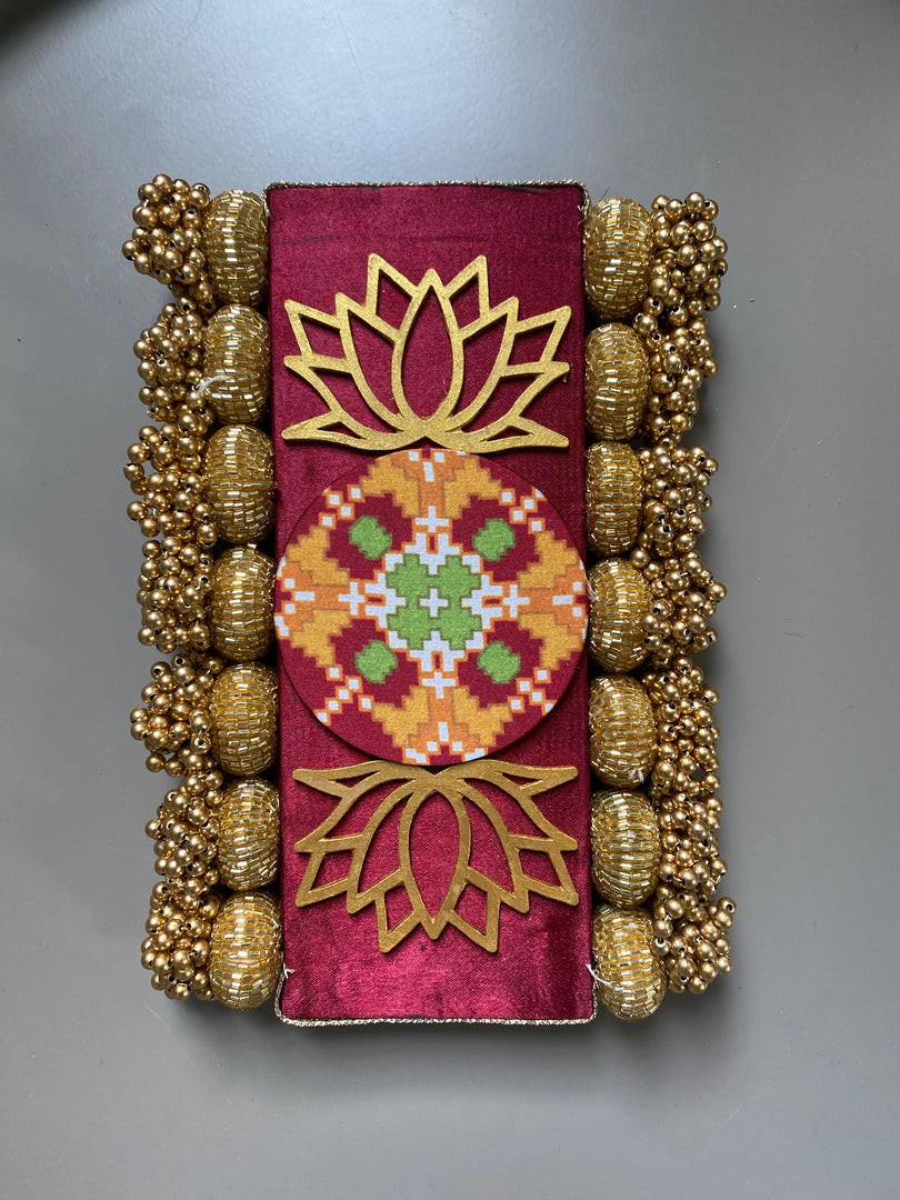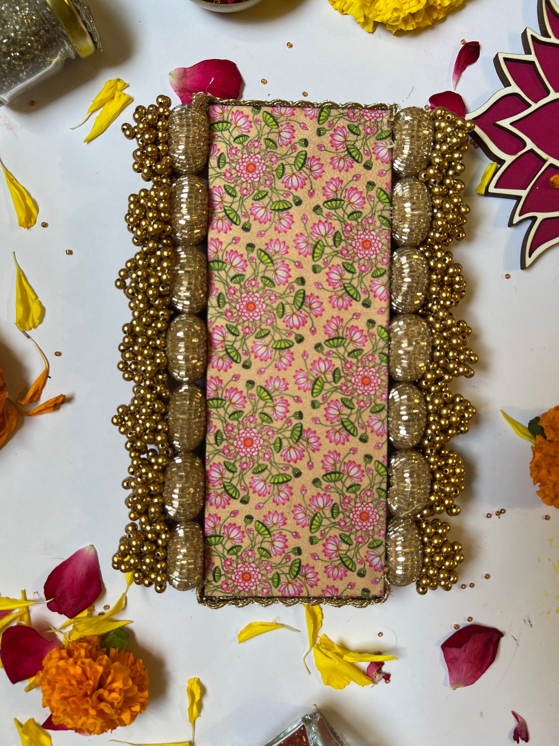 DETAILS IN DETAIL: It is a stand alone single piece beauty, it has two different sides, it is covered in flat digital print on one side + embossed motif on the other side. The basal diameter of this pallet is 8 inches X 3 inches, it is firm and sturdy- there is a foam base which makes it cushiony and soft. The pallet has beads on the longer periphery which are hand-sewn on at the base. It is 8 inches X 6 inches including the beads.