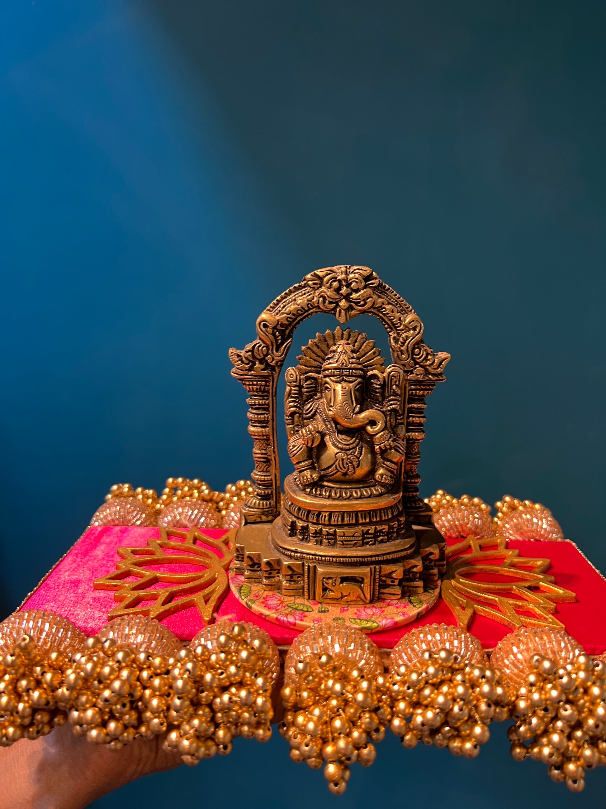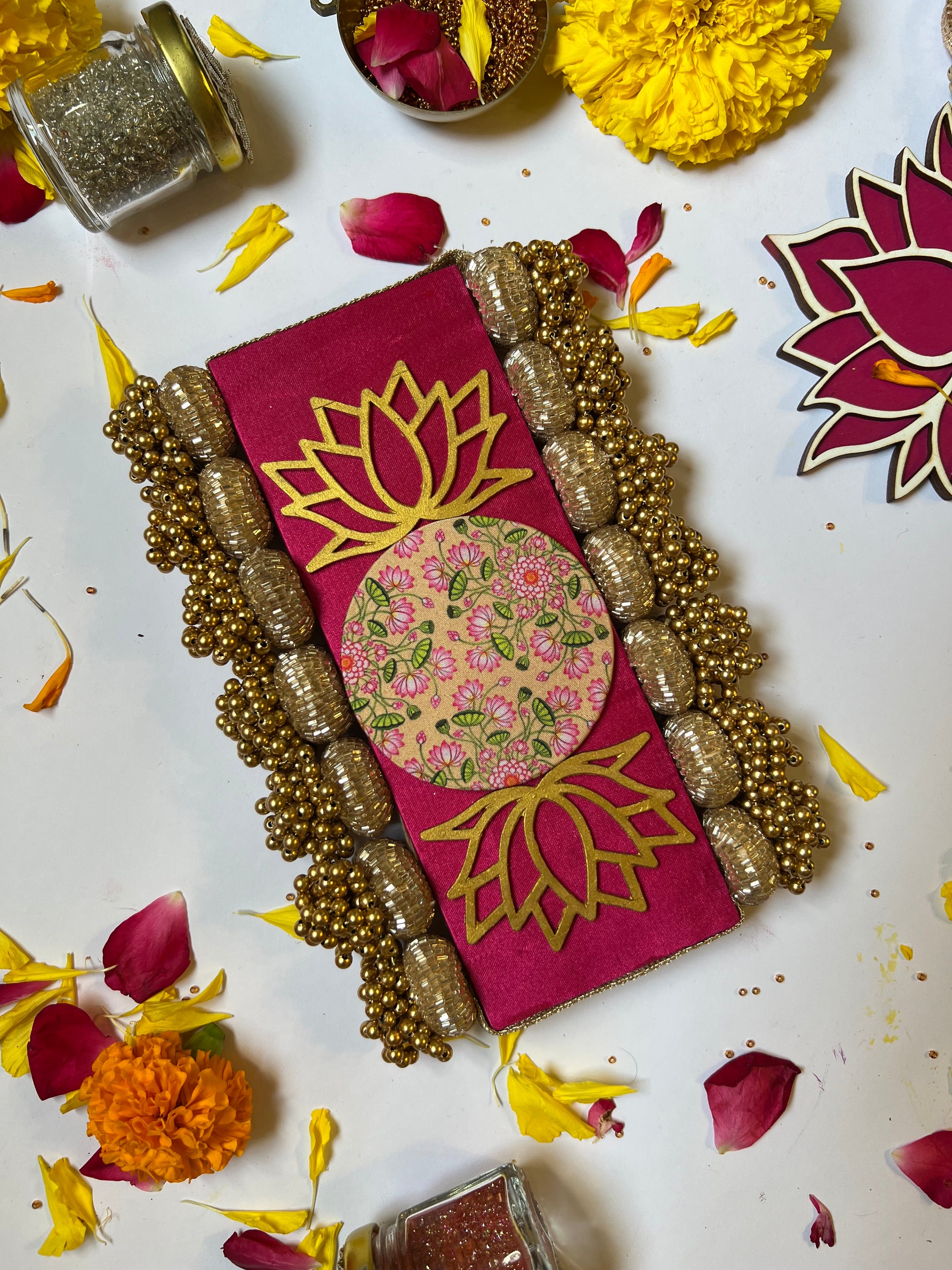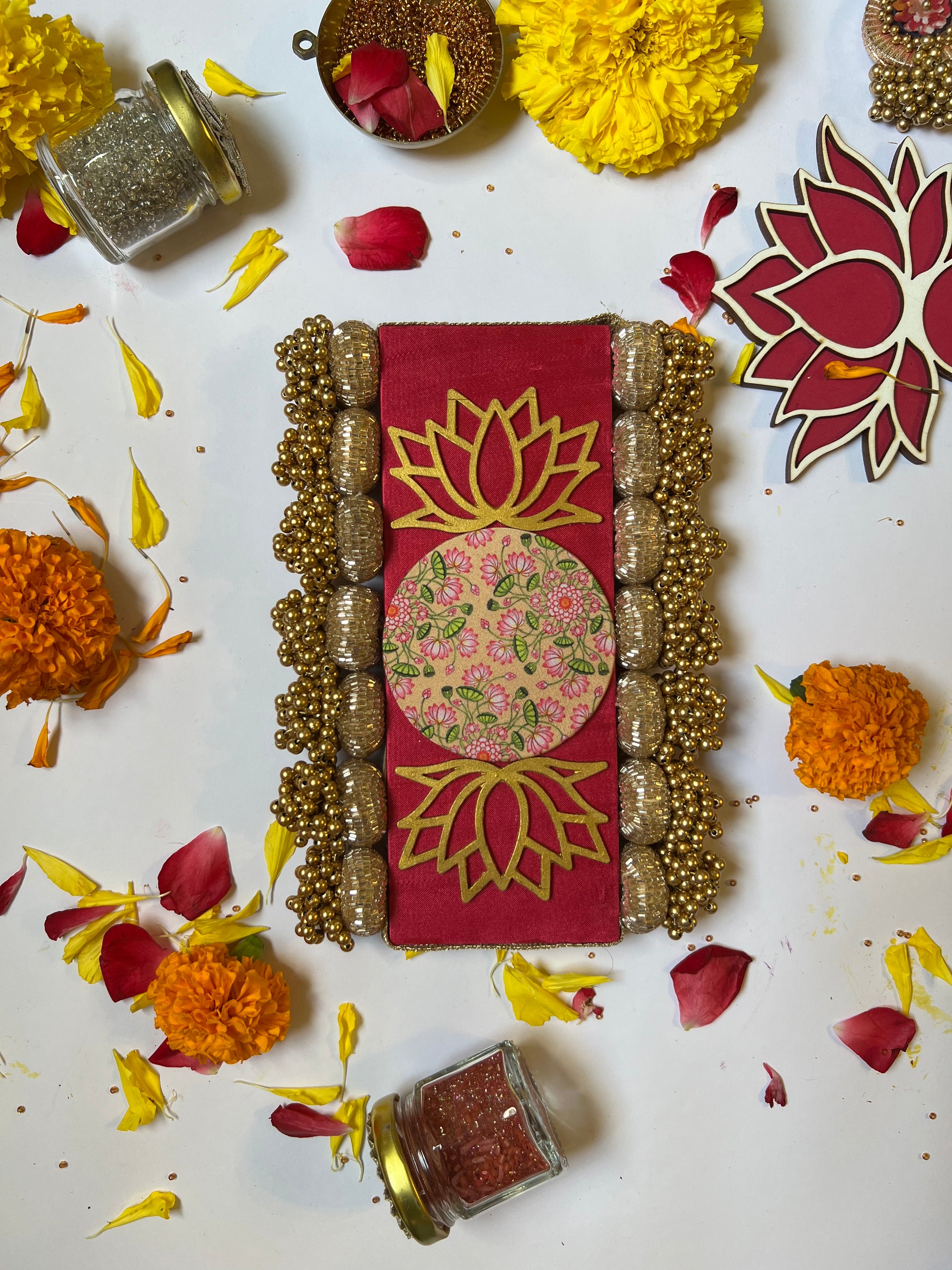 DETAILS IN DETAIL: It is a stand alone single piece beauty, it has two different sides, it is covered in flat digital print on one side + embossed motif on the other side. The basal diameter of this pallet is 8 inches X 3 inches, it is firm and sturdy- there is a foam base which makes it cushiony and soft. The pallet has beads on the longer periphery which are hand-sewn on at the base. It is 8 inches X 6 inches including the beads.