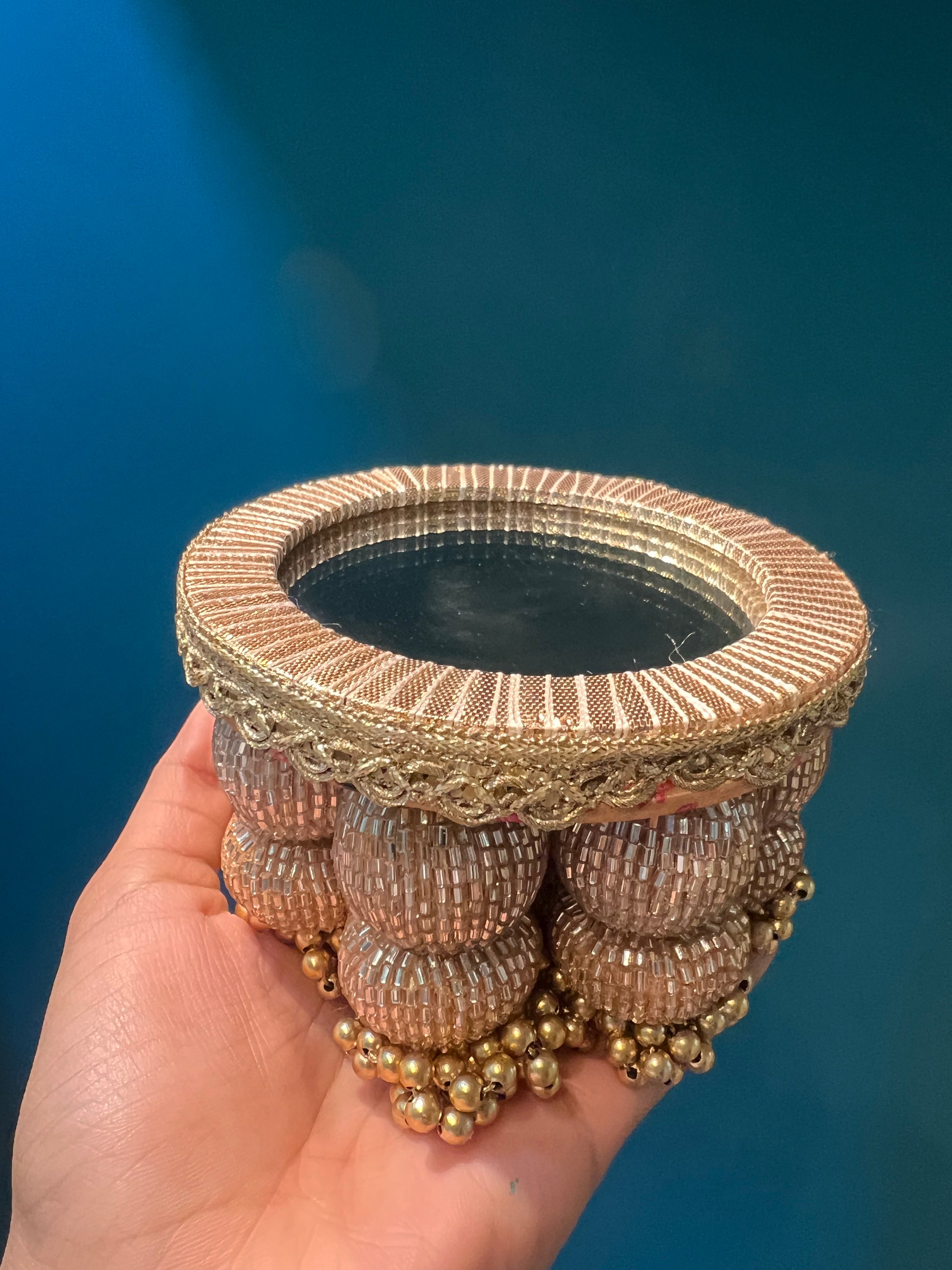 DETAILS IN DETAIL: The basal diameter of the dangler plaller is 4 inches and tassel length up to the beads is 3 inches. This platter has a solid surface below the fabric and can be used for various occasions. The beads of the platter are made using wood and cylindrical beads with metallic shine are wrapped inside-out.