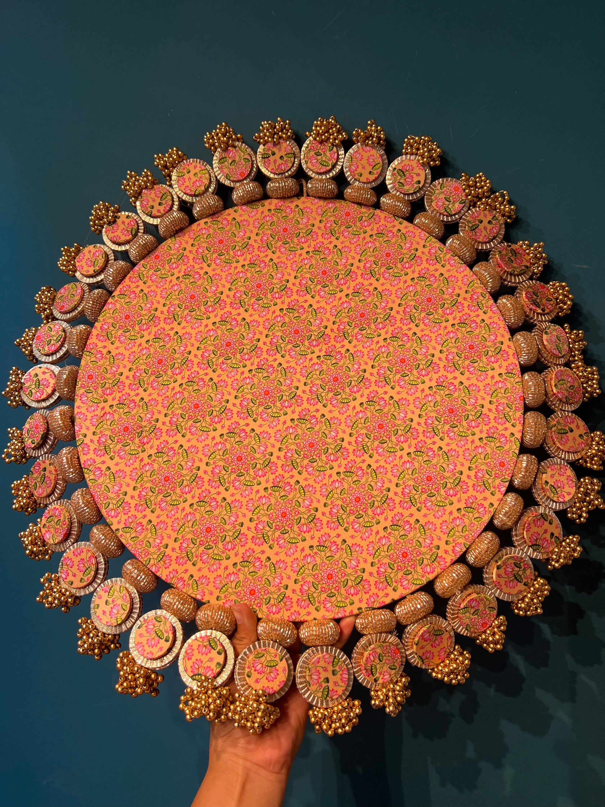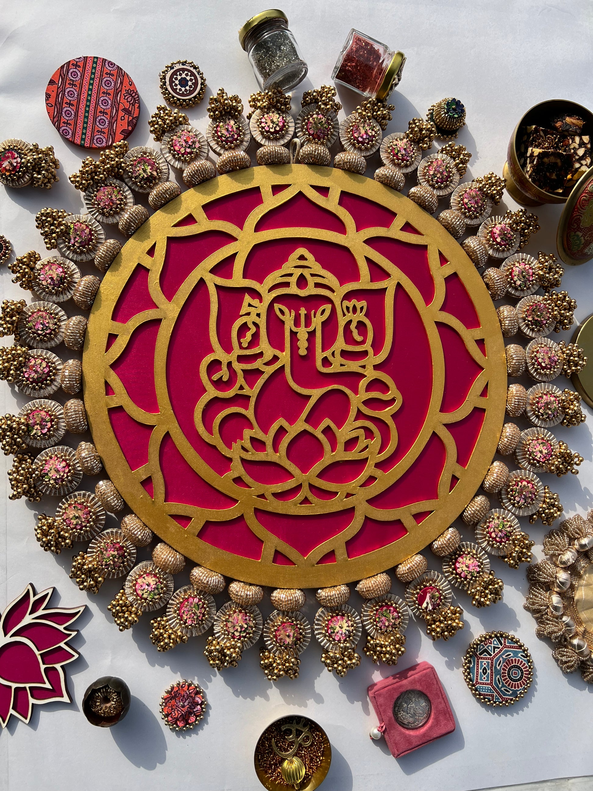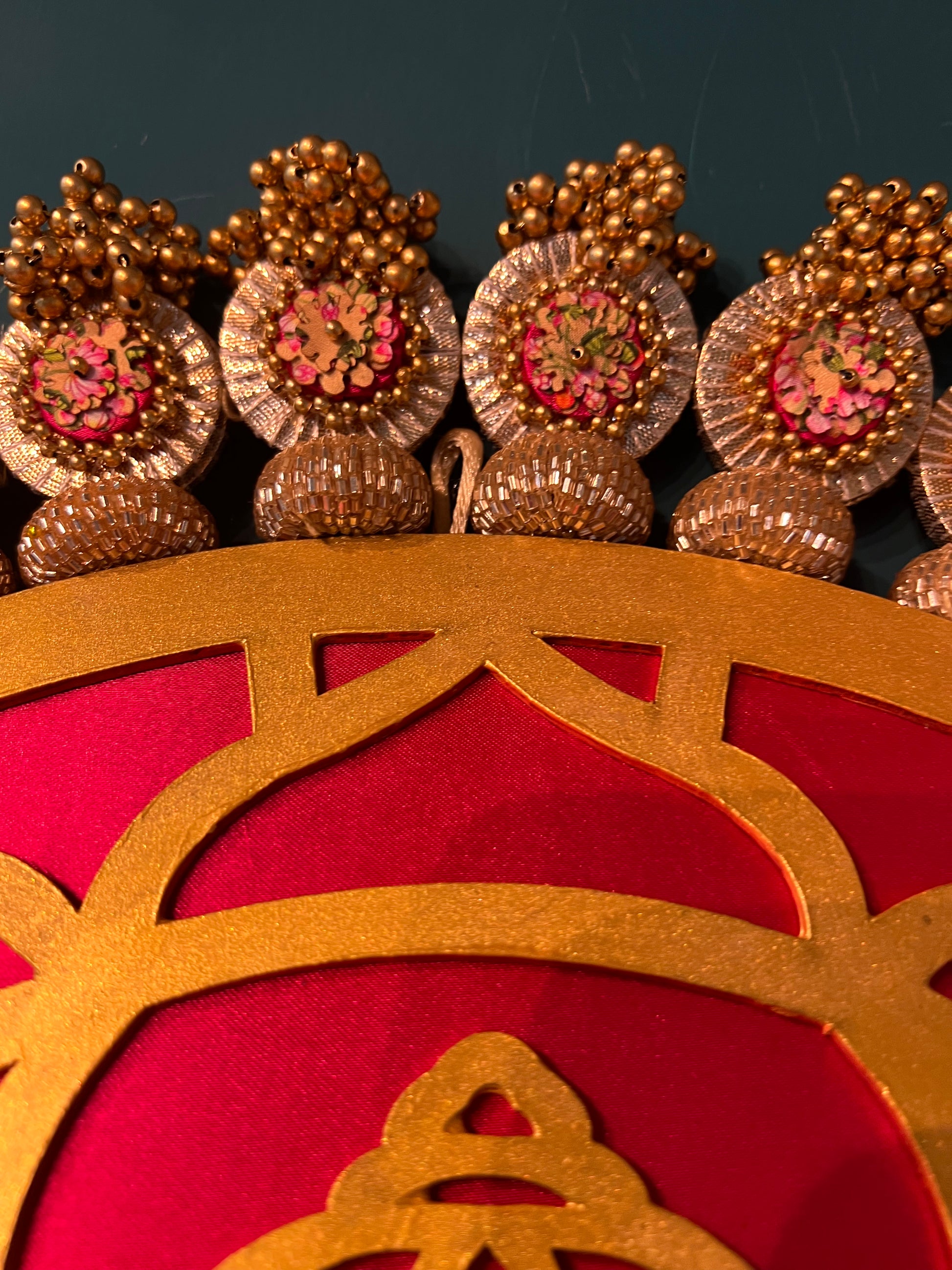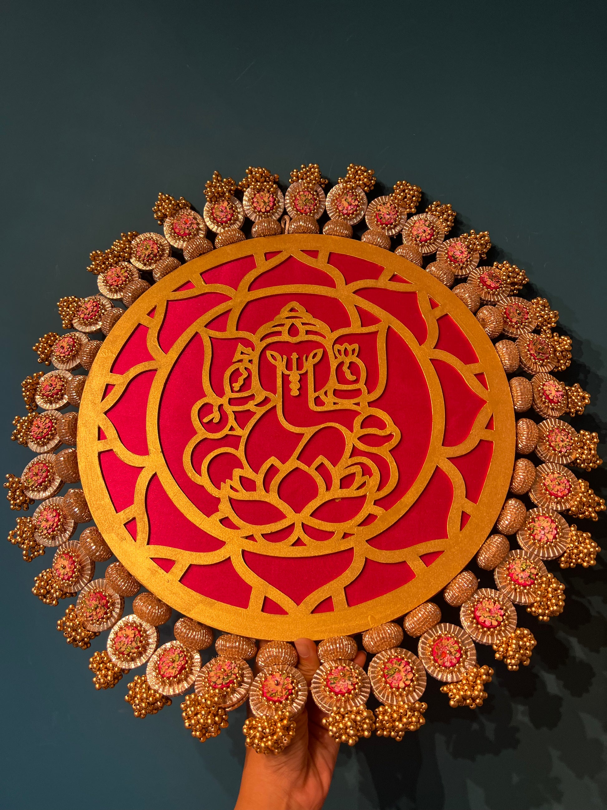 IBHI has crafted a masterpiece – an intricately cut Ganesh motif rangoli adorned with our signature lumba tassels. The rangoli boasts a basal diameter of 12 inches, and with the elegant tassels, it extends to a graceful 15 inches.