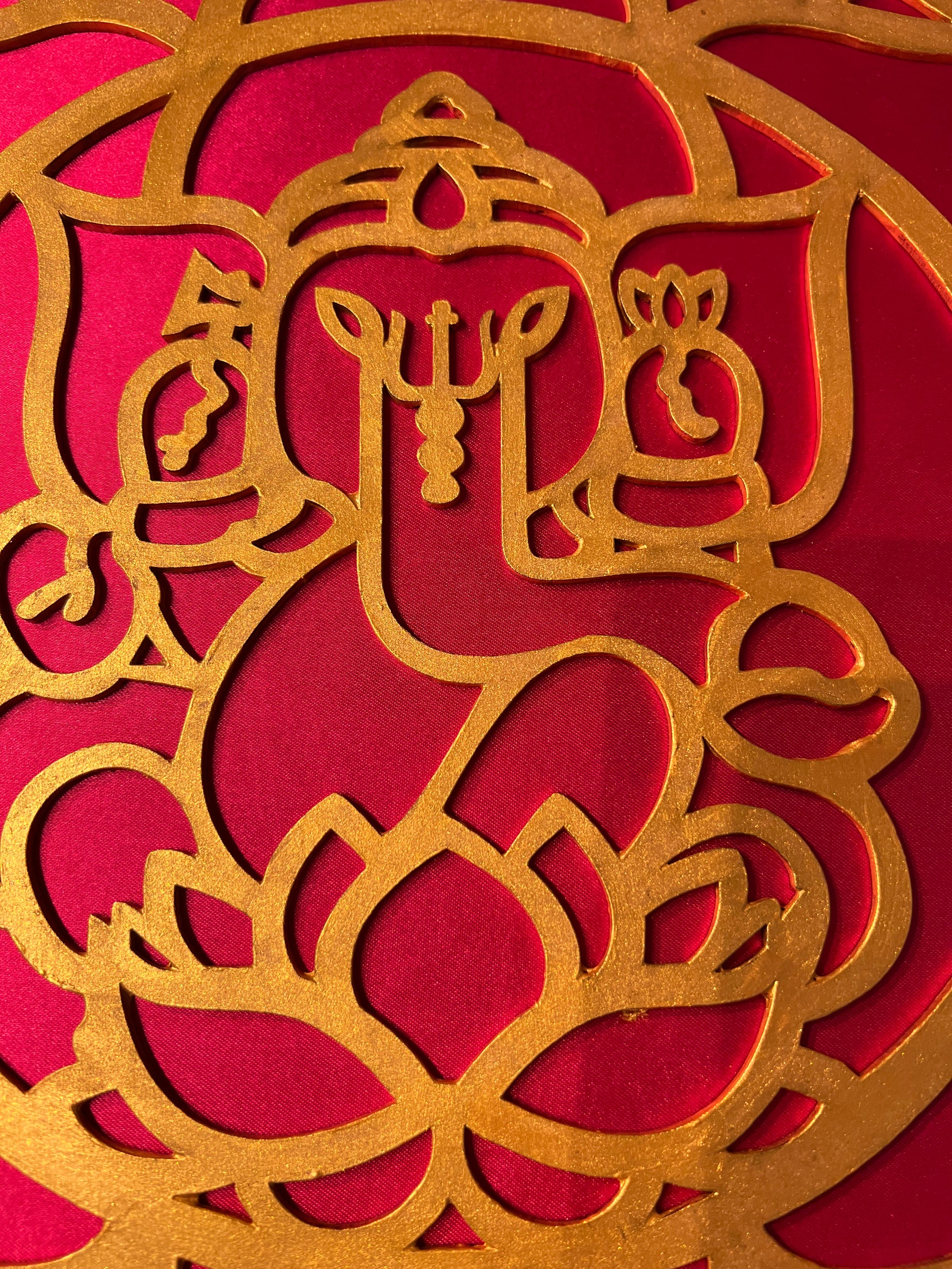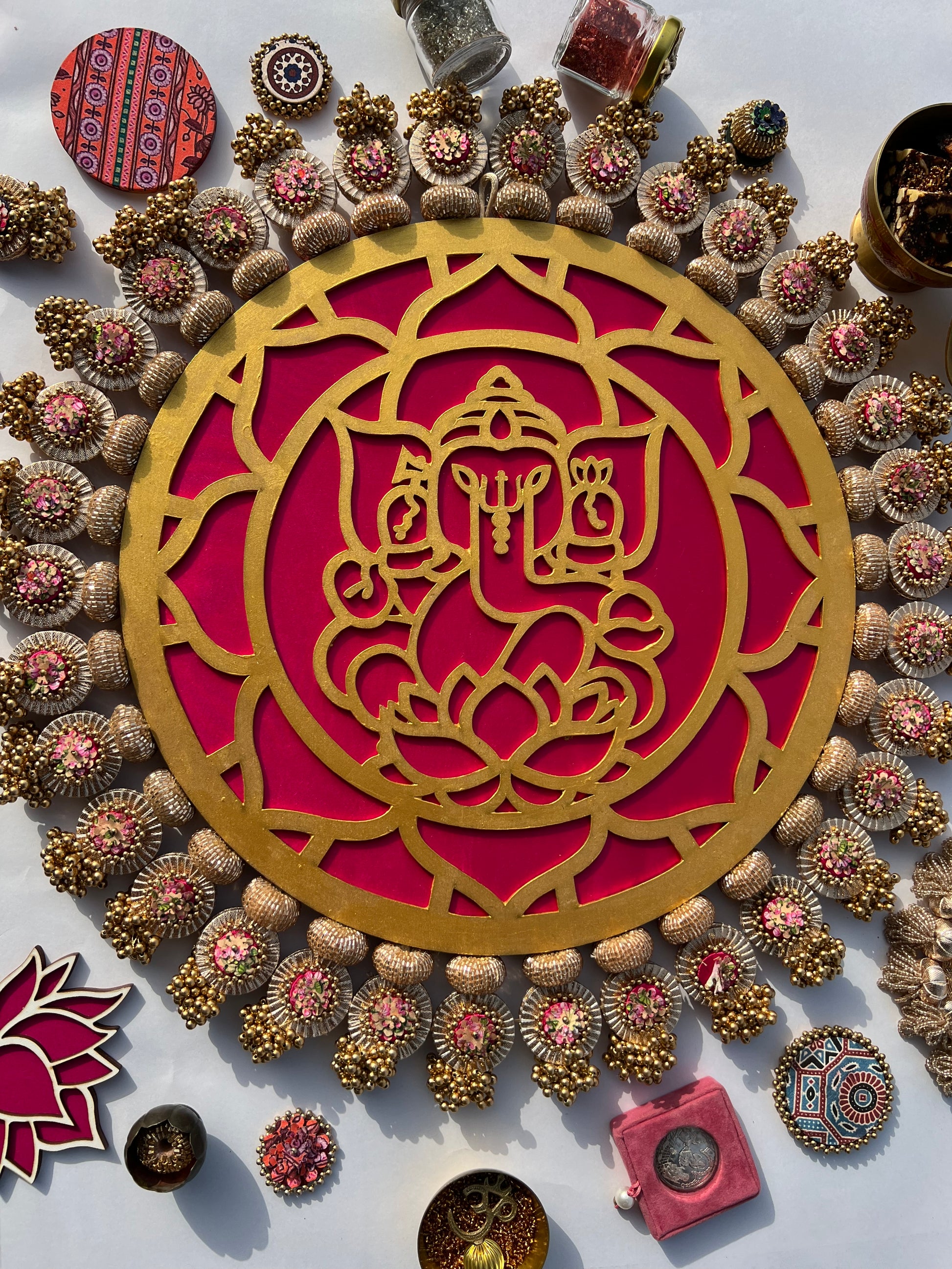 For added versatility, a discreet loop of thread has been thoughtfully incorporated within the rangoli. This subtle addition allows you to effortlessly hang the exquisite Ganesh rangoli on your wall, transforming your space with its divine presence.