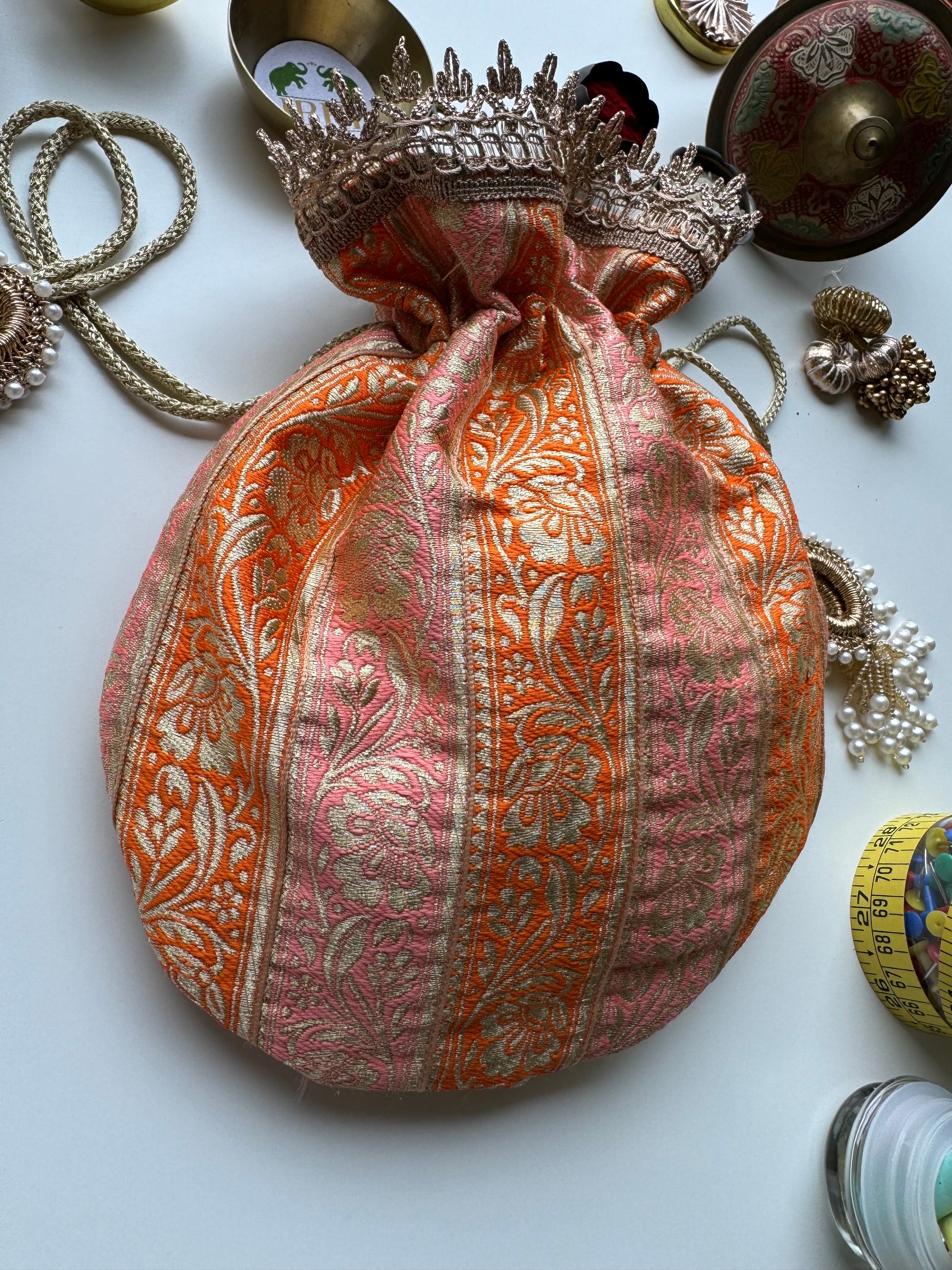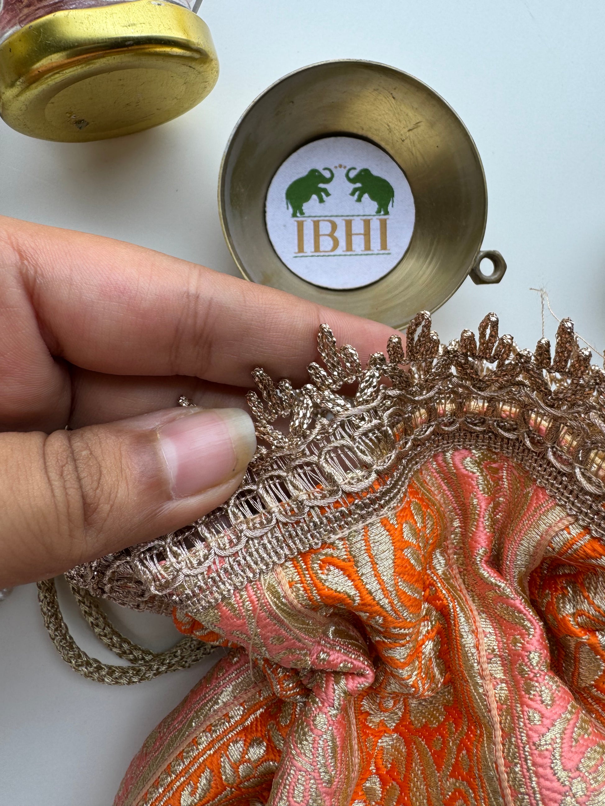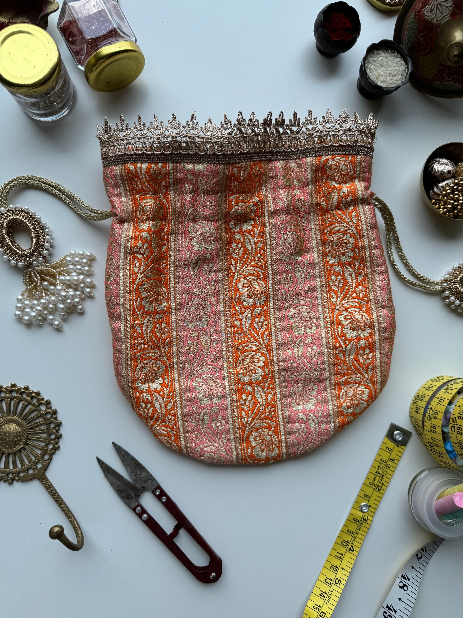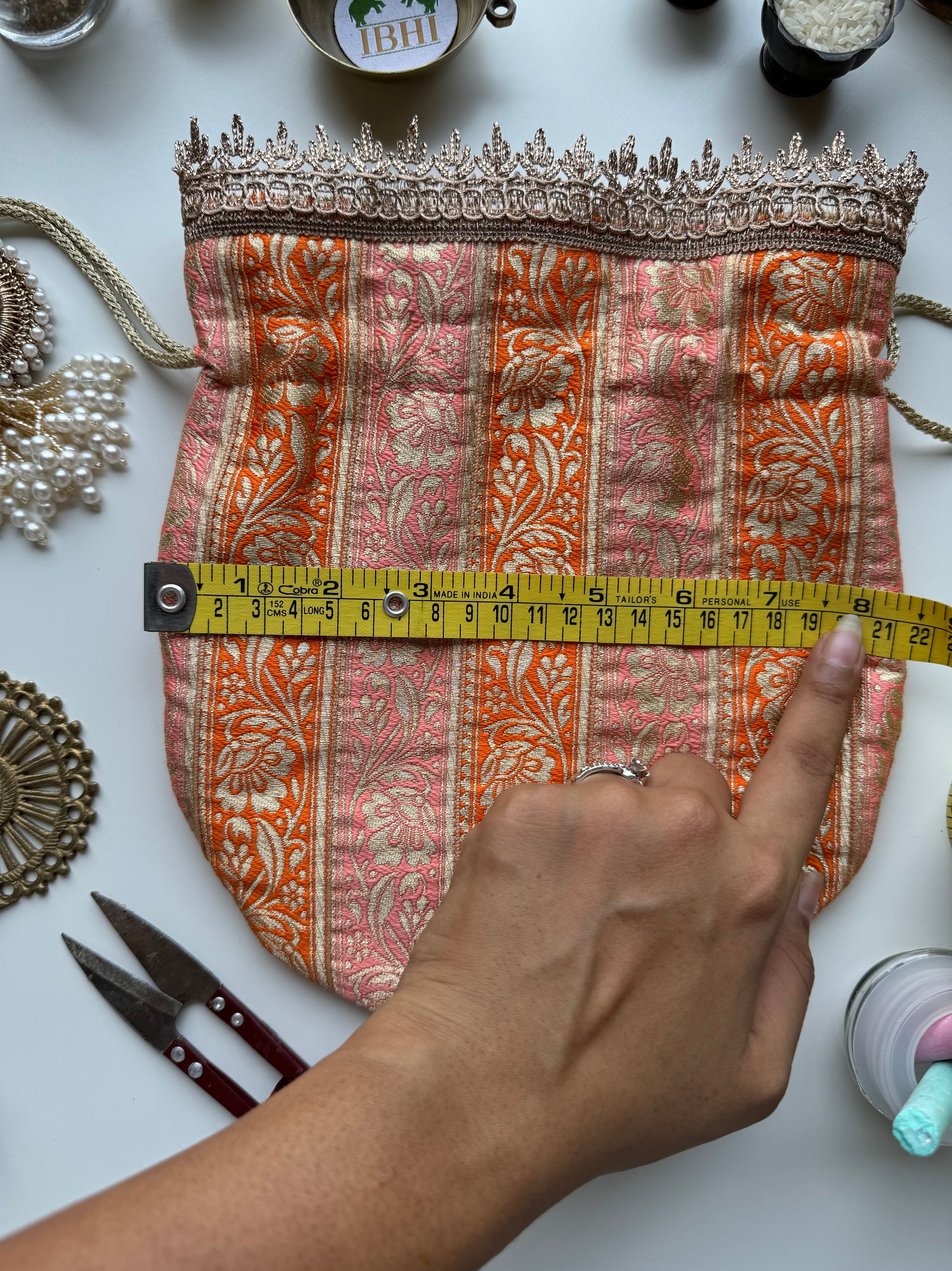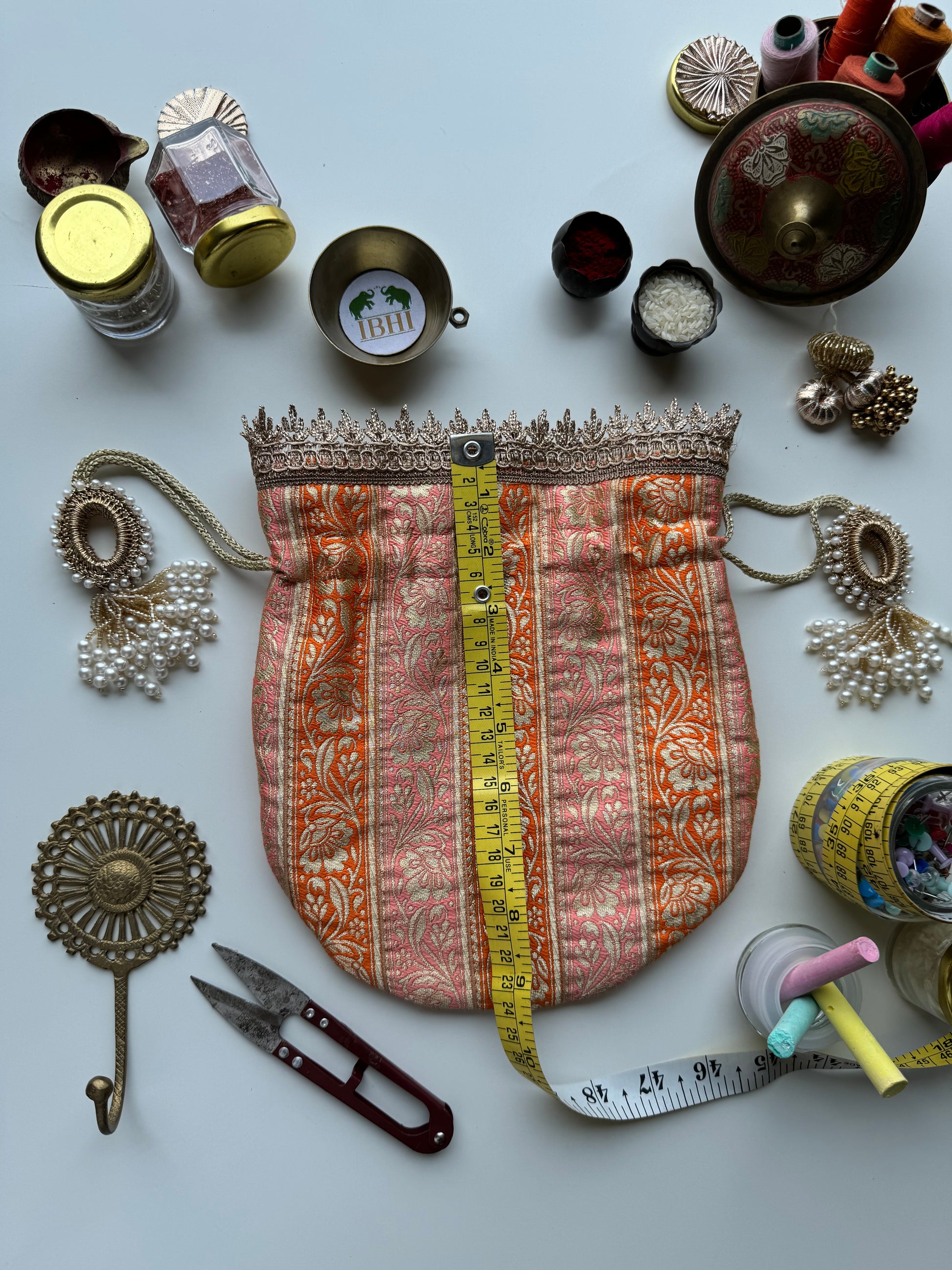 Kesari Kumud Potli bag is made by stitching together blush pink & baby orange floral veil panels. For a finishing bold touch, solid gold zari lines on both ends of each panel. Towards the mouth of the potli bag where it closes, a rose gold tone crochet lace completes the potli bag.