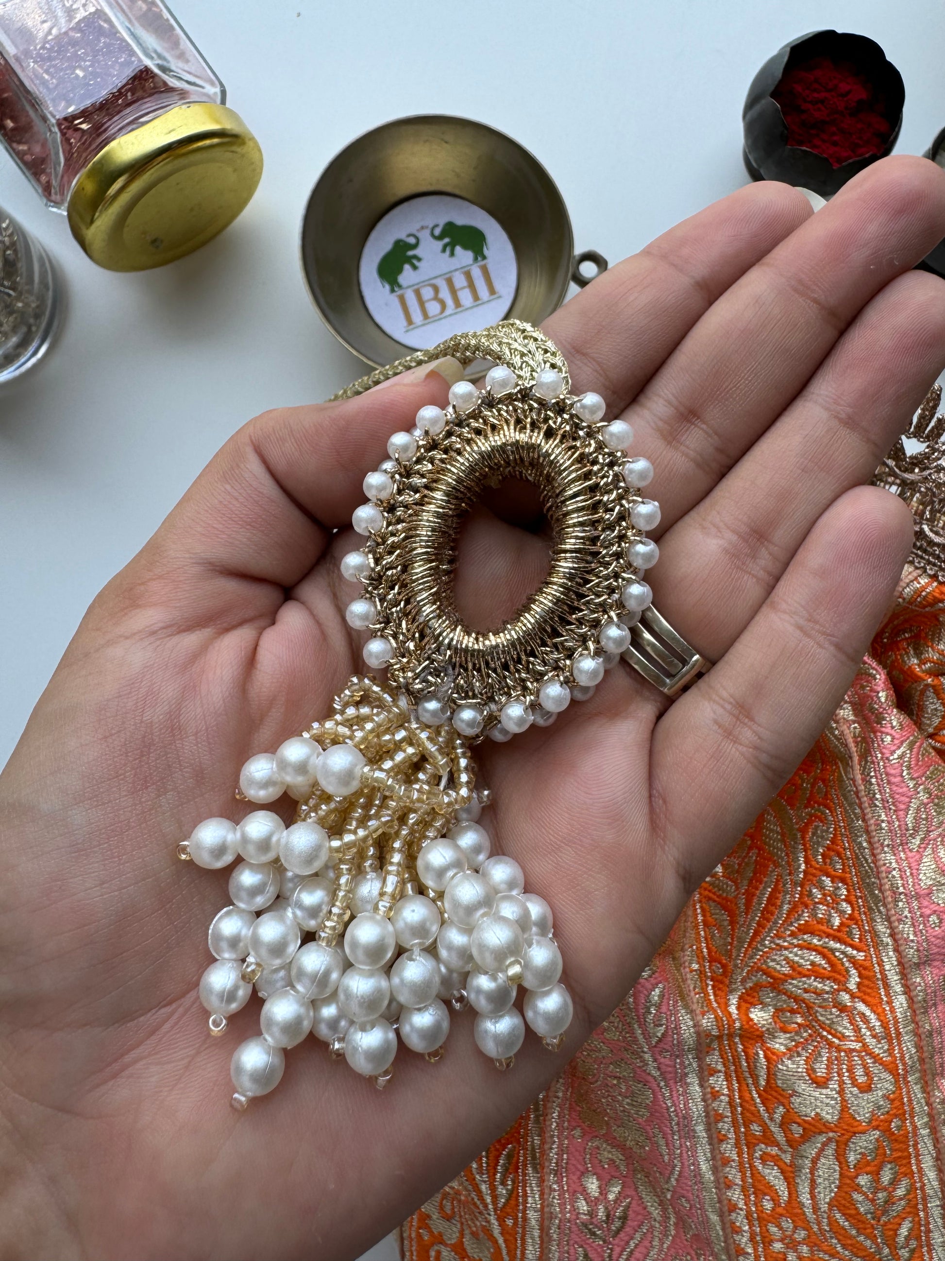 The tassels of the potli bag are made using crochet patches with pearl white beads on the periphery and a fountain style light golden and pearl white beads.