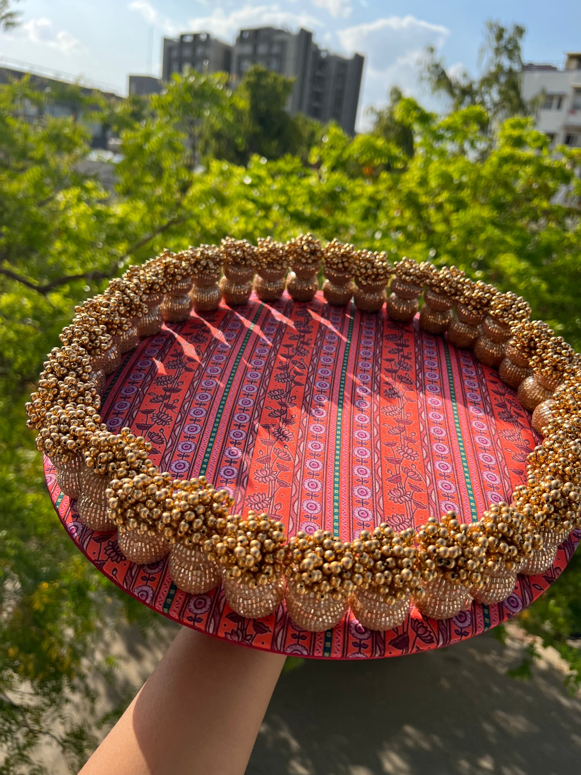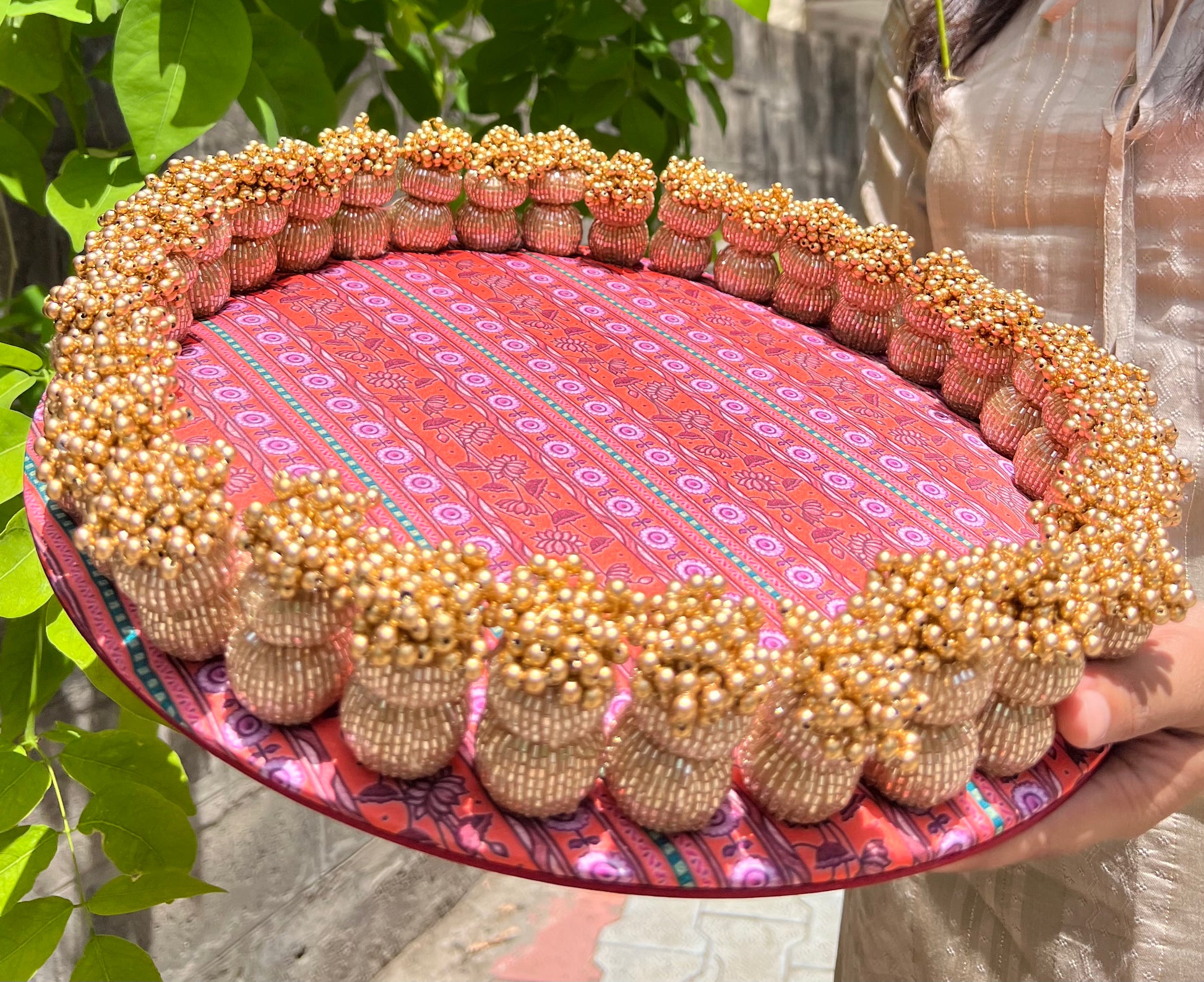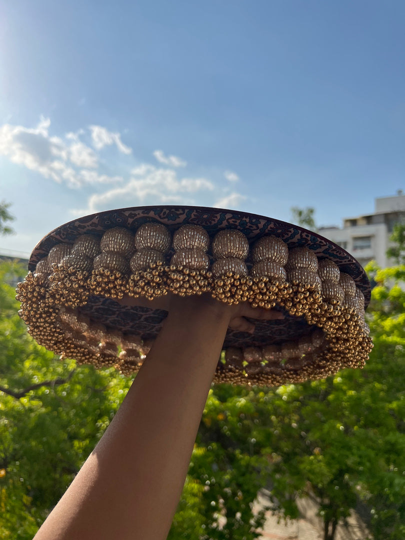 DETAILS IN DETAIL: The basal diameter of the dangler plaller is 14 inches and tassel length up to the beads is 3 inches. This platter has a solid surface below the fabric and can be used for various occasions. The beads of the platter are made using wood and cylindrical beads with metallic shine are wrapped inside-out.